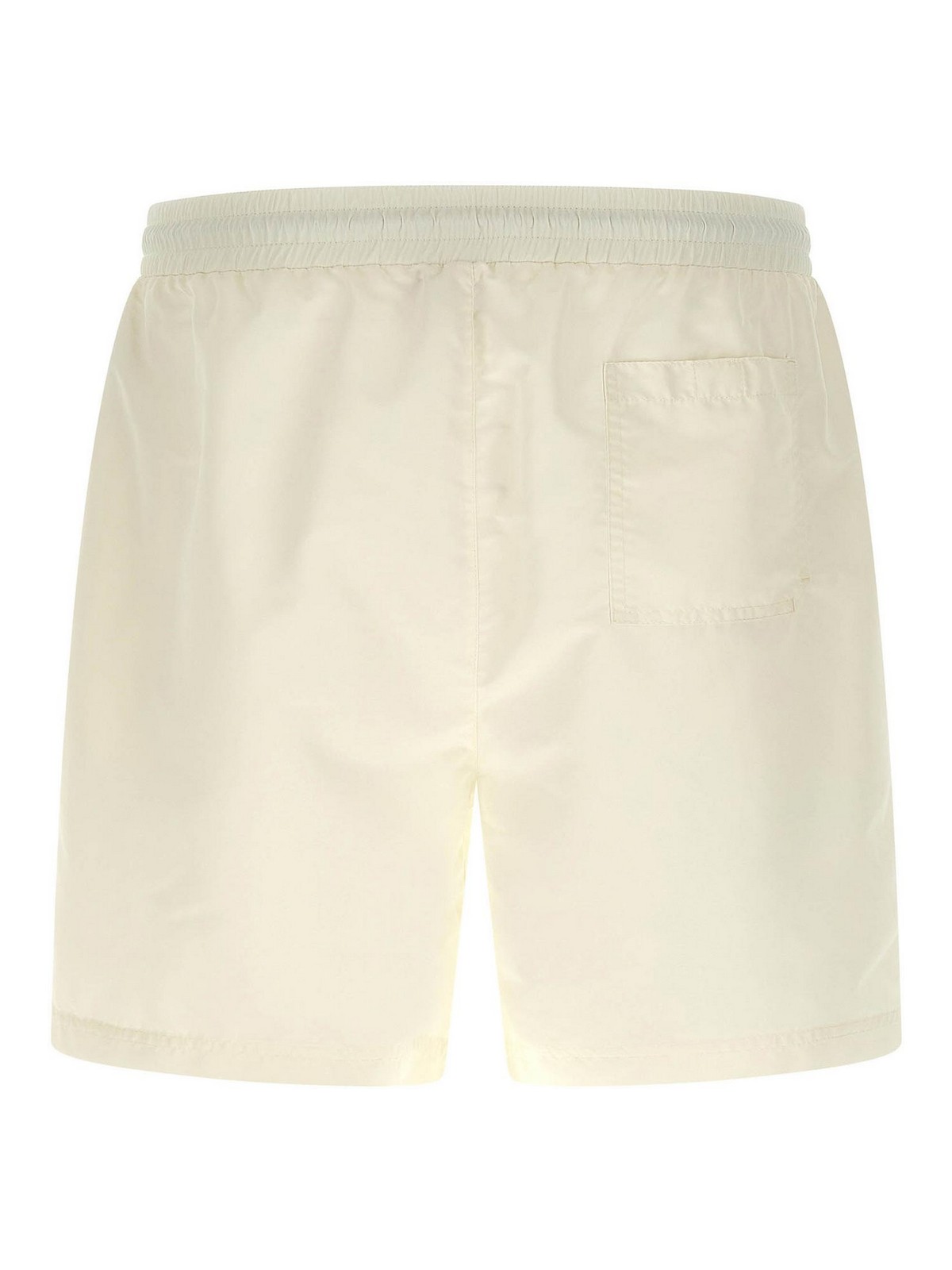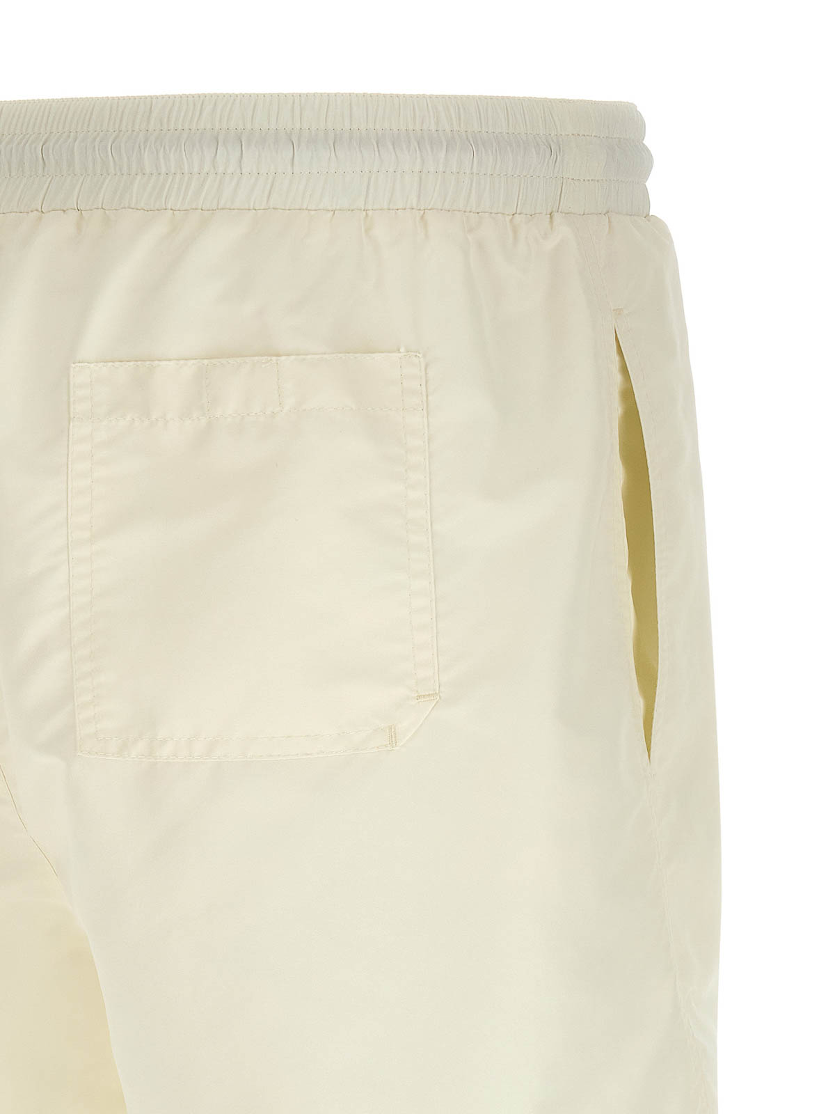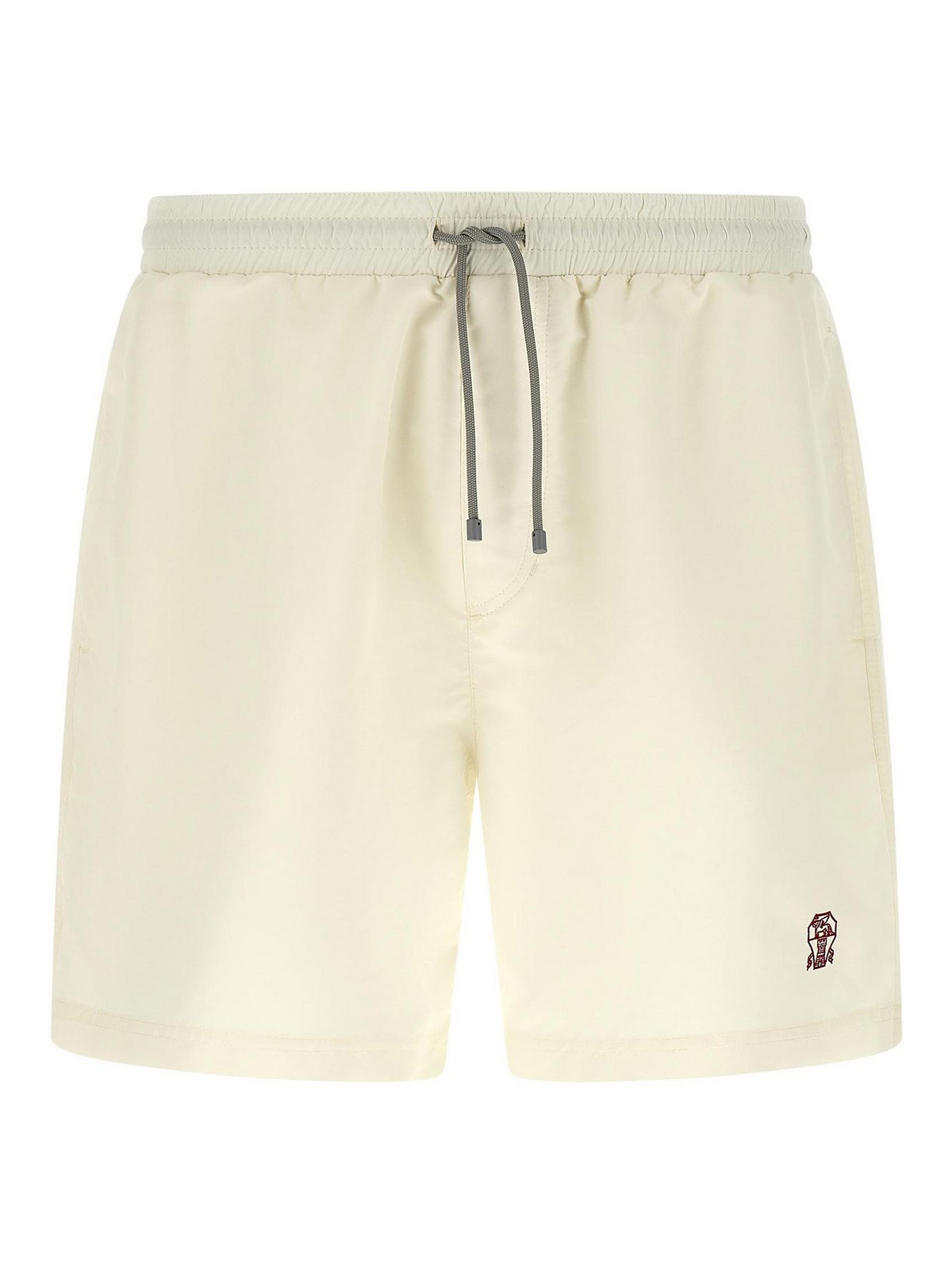 マットナイロンの水着、フロントにソロメオの紋章のロゴが刺繍され、ウエストにドローストリング付きゴム入り、トロンプルイユフラップ、ポケット、インナーメッシュブリーフ。