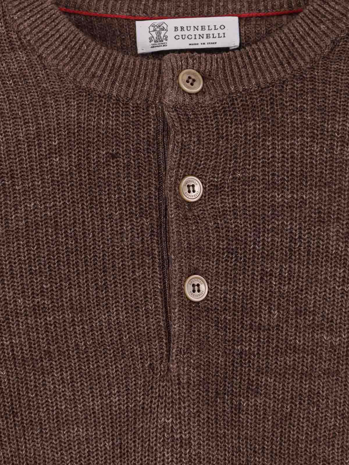 スリーボタンクロージャー、クルーネック、リブ編み、袖口付きロングスリーブ、77% リネン、23% コットン。