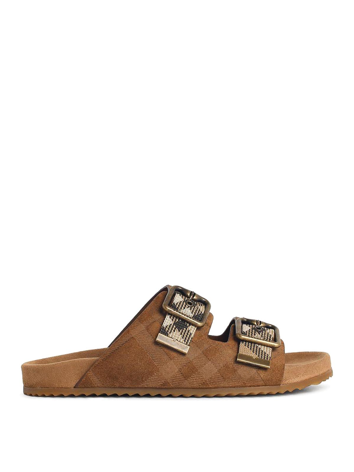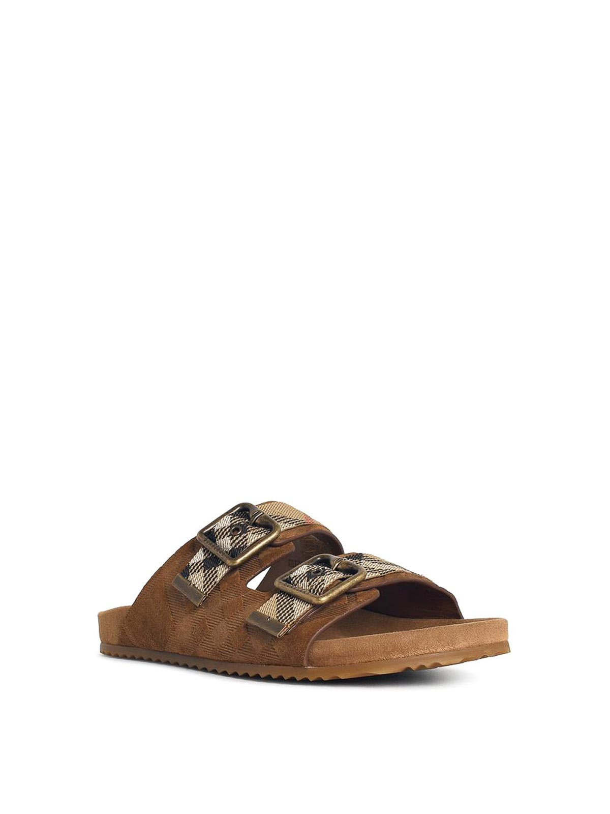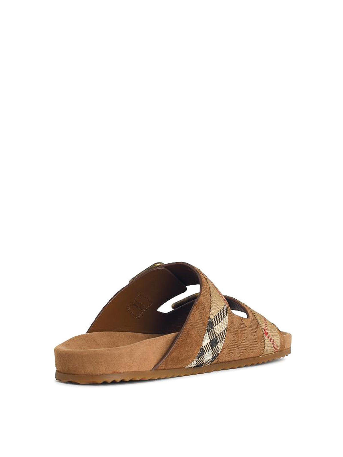バックルストラップ付きトップアジャストメント、「バーバリーチェック」パターンのエンボス加工、エンボス加工ロゴ付きスエードインソール、ラバーソール