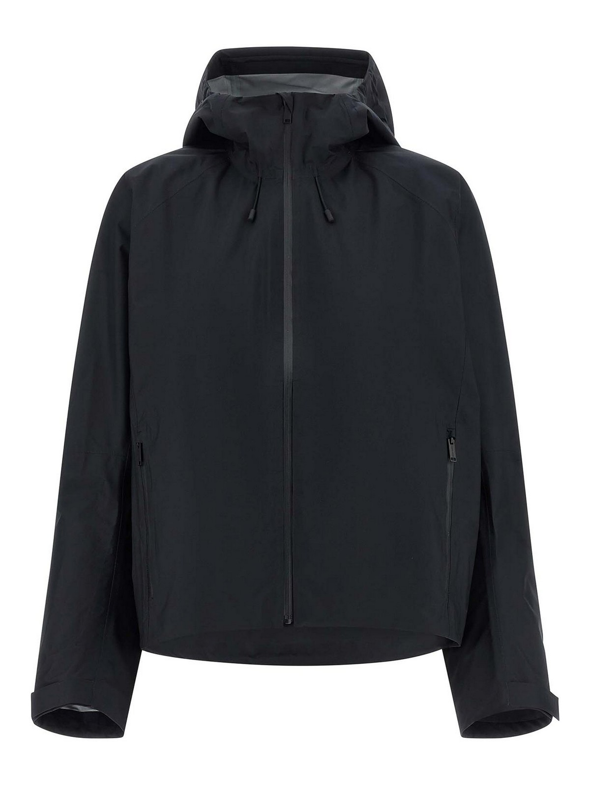 撥水加工生地のHorizon' ウィンドブレーカー、裏地なし、調節可能なフード、フロントファスナー、ポケット、調節可能な袖口とトーン・オン・トーンのロゴプリント付きロングスリーブ、裾にドローストリング付き。