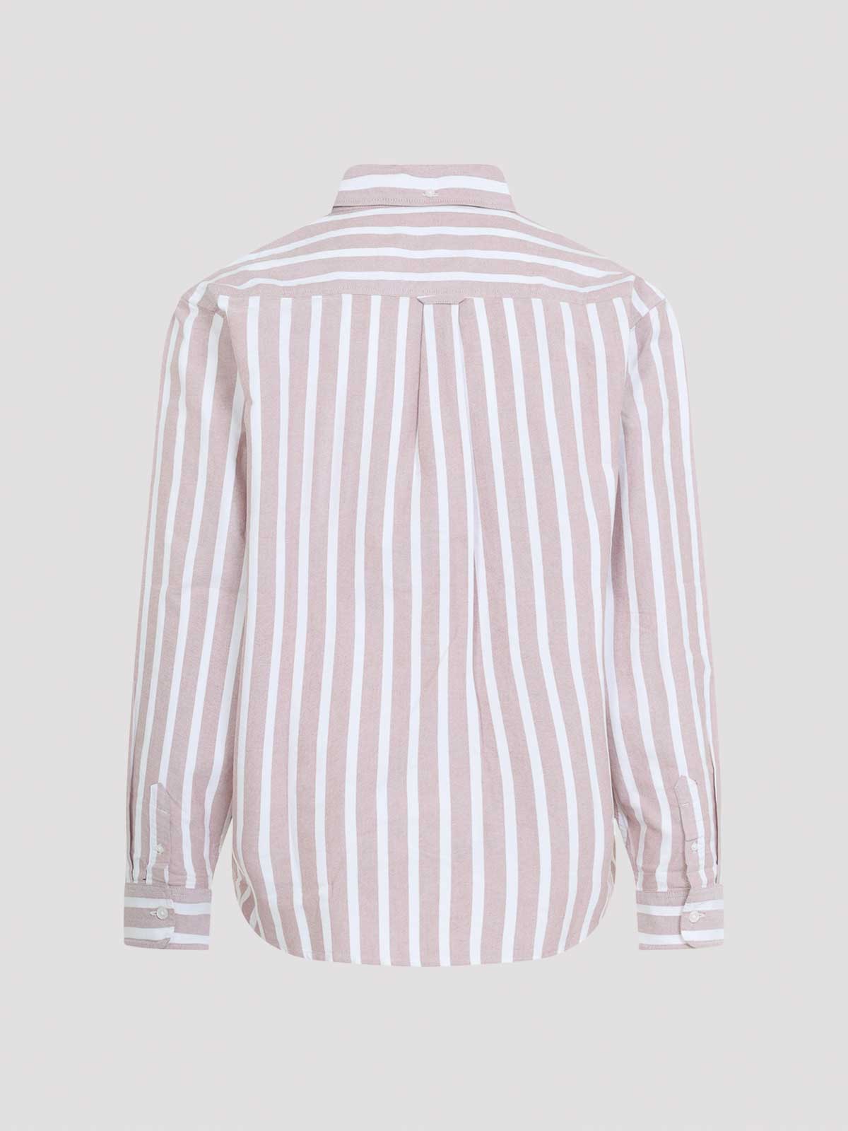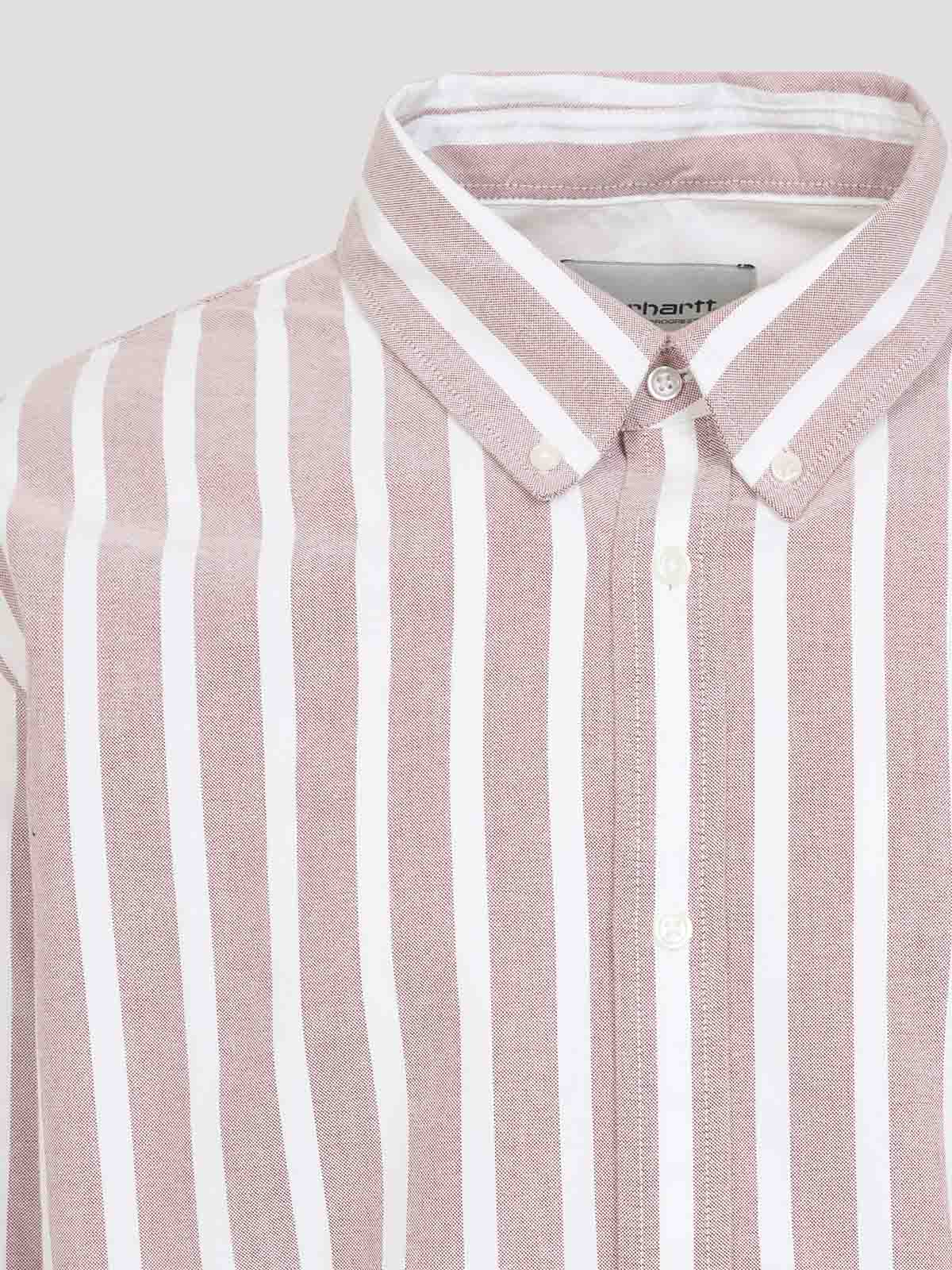 Carhartt wip deven 赤と白のコットンシャツ。赤と白のオックスフォードコットン製のルーズフィットシャツ。全体にストライプ模様が施されています。ボタンダウンカラー、フロントボタン留め、胸に刺繍ロゴ、ドロップショルダー、ボタン付きカフス付きロングスリーブ、バックヨークとボックスプリーツ、ラウンドヘムが特徴です。