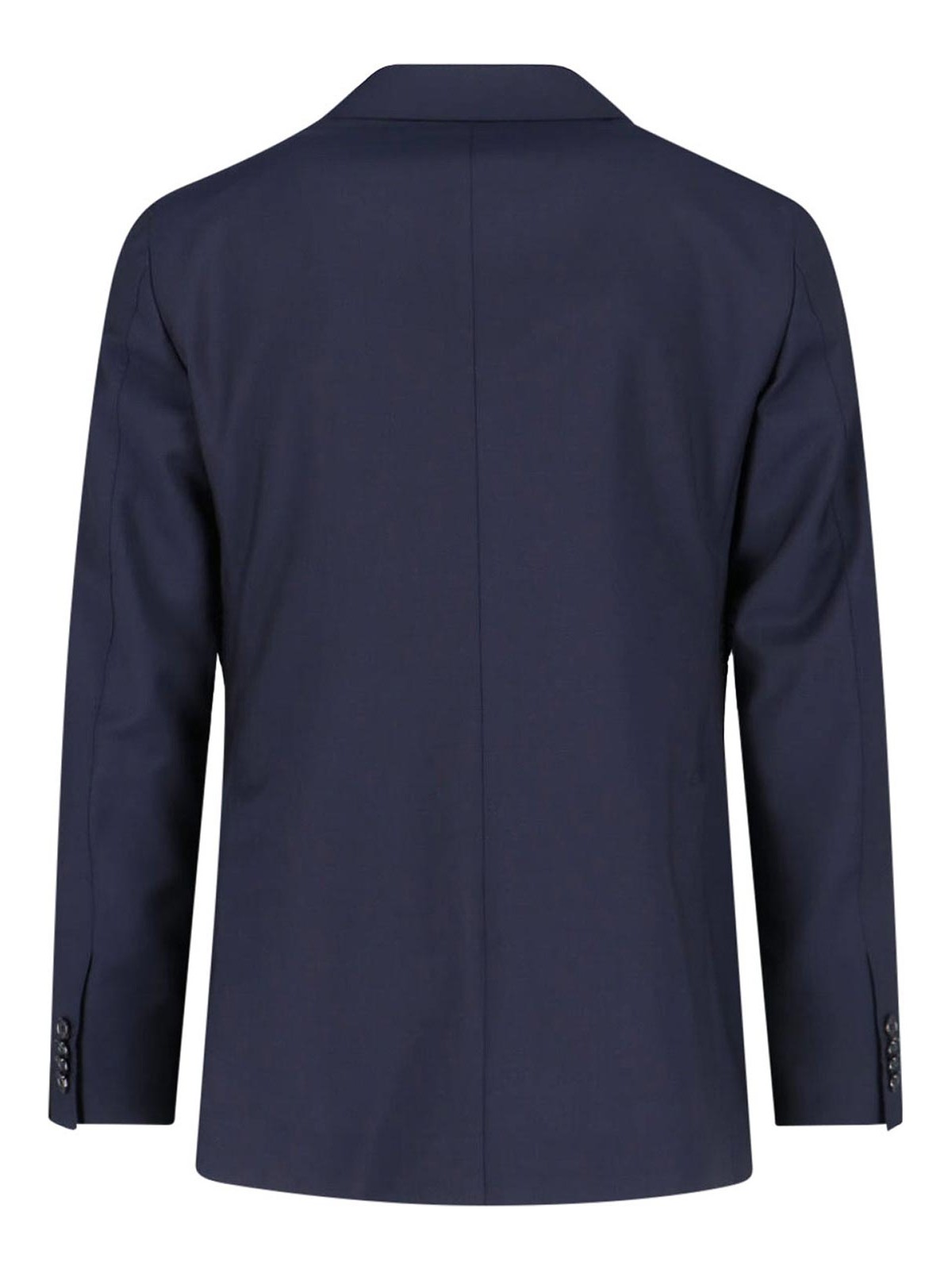 ブルーウールとモヘア混紡のダブルブレストスーツ、ダークシェード、ピークラペル、フロントダブルブレストボタンクロージャー、フロントウェルトポケット2つ、胸フラップポケット1つ、カフボタン、袖にロゴラベル、テーラードパンツ、ボタンとジップクロージャー、ベルトループ、フロントダーツ、バックウェルトポケット2つ、しっかりしたレッグ。