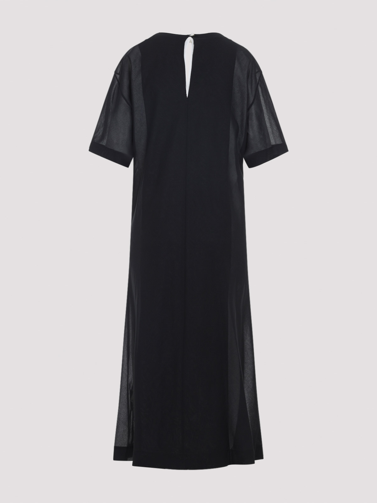 彫刻を施した薄手のドレープを施したブラックコットンのミディドレス。前面2層構造のミディドレス。黒のセミシアーコットン製で、ラウンドネックラインにドレープ加工のディテールが施され、半袖、背面にボタン留めが付いたティアドロップカットアウト、サイドポケット、ストレートヘムが特徴です。