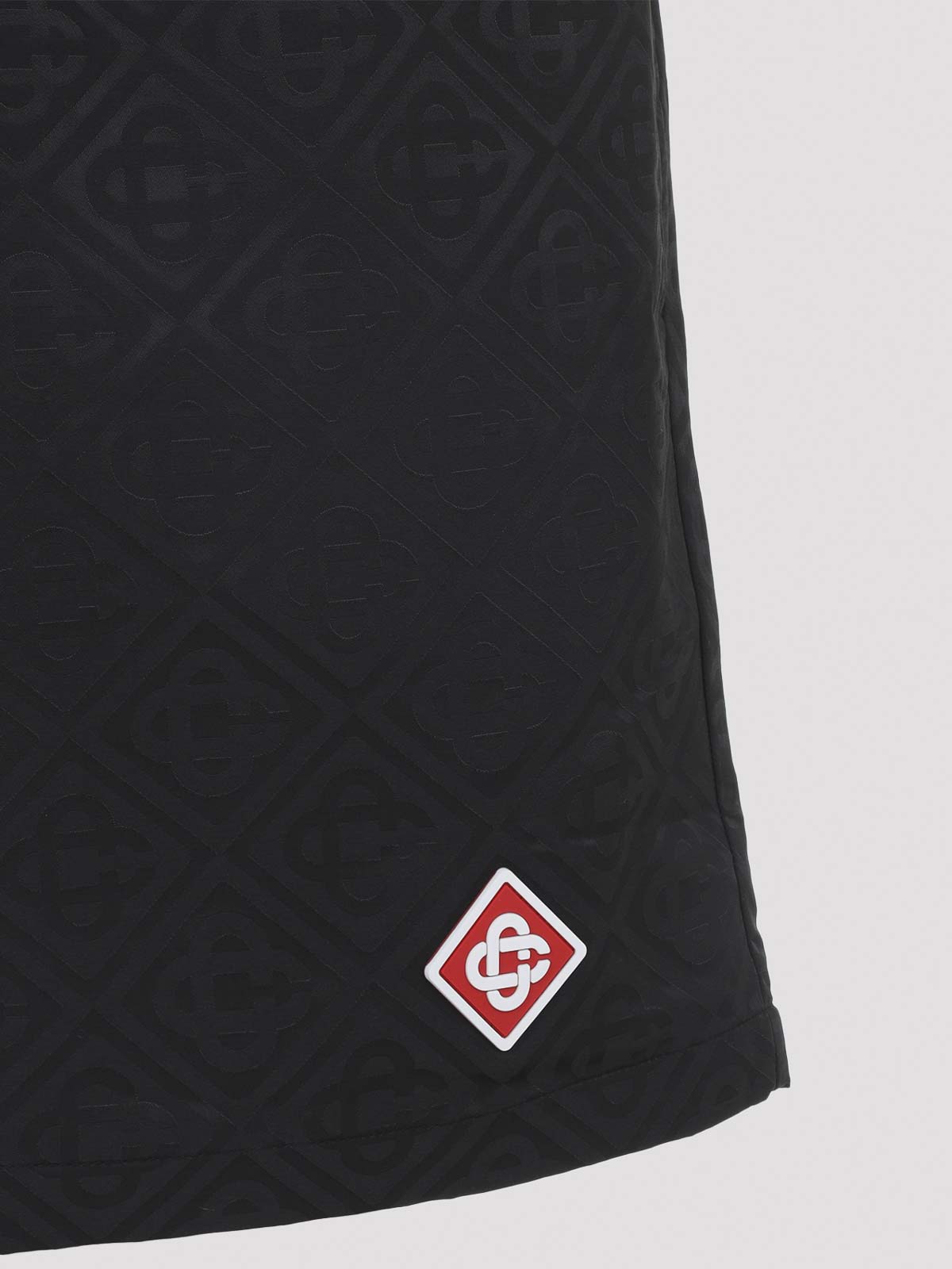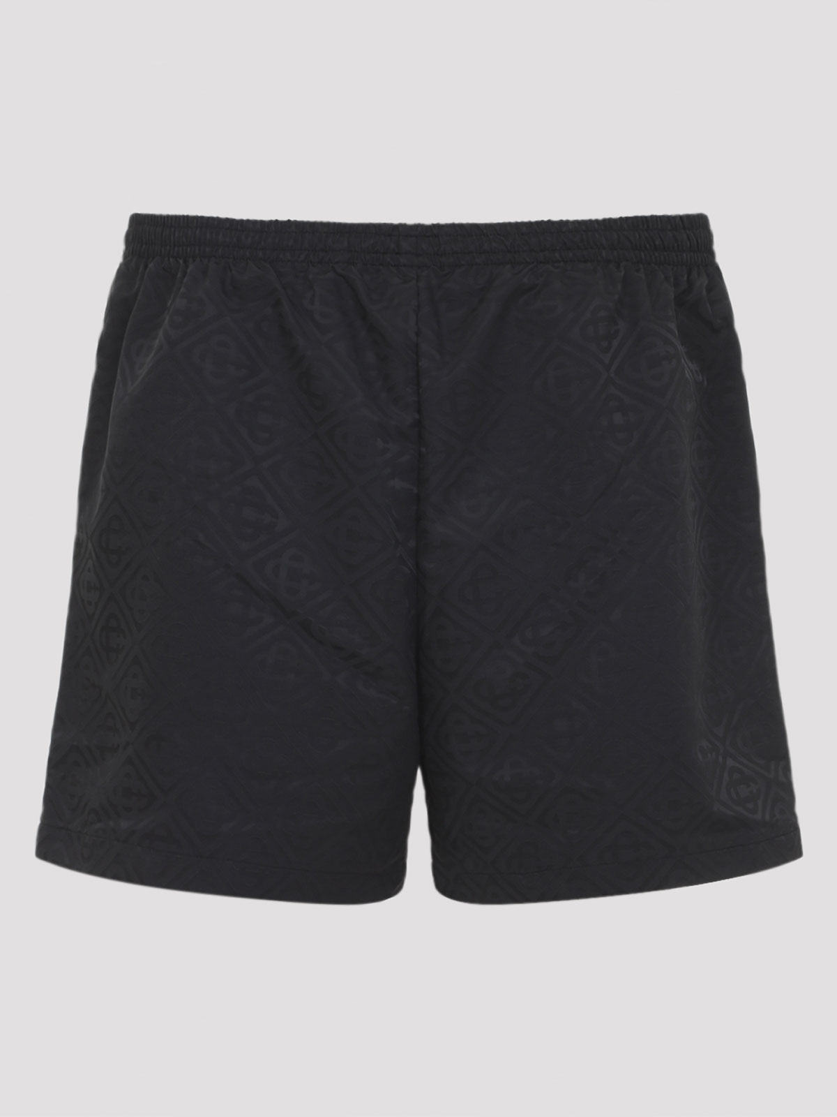 カサブランカジャガードブラックポリエステルスイムショーツ。ブラックのテックファブリックに同系色のシグネチャーモノグラムを全面にあしらい、隠しドローストリング付きの伸縮性のあるウエストバンド、股下サイドポケット2つ、前面にロゴパッチ、ファブリックの裏地が付いています。