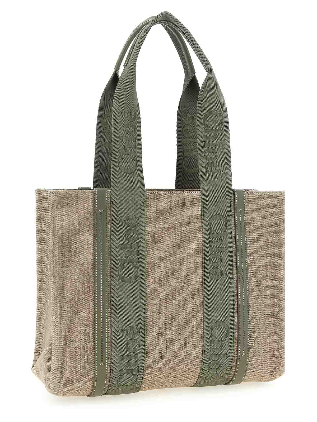 レザーのディテールをあしらったリネンキャンバスのミディアム「ウッディ」ショッピングバッグ。ロゴキャンバスのダブル固定ハンドル、調節・取り外し可能なレザーショルダーストラップ。