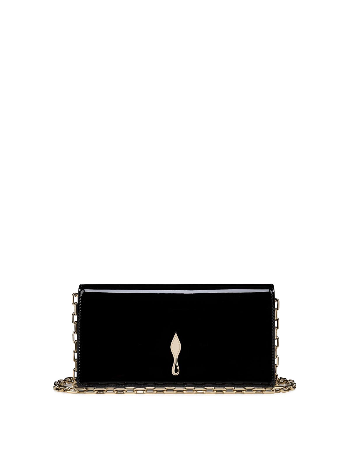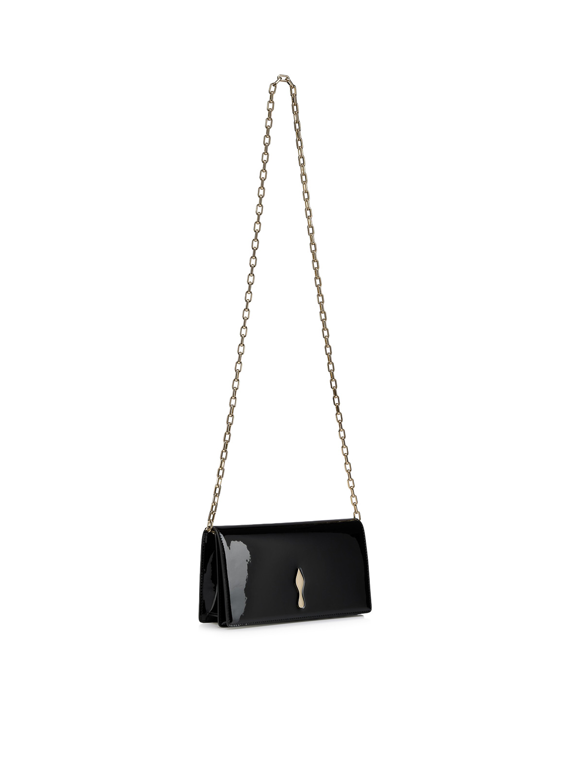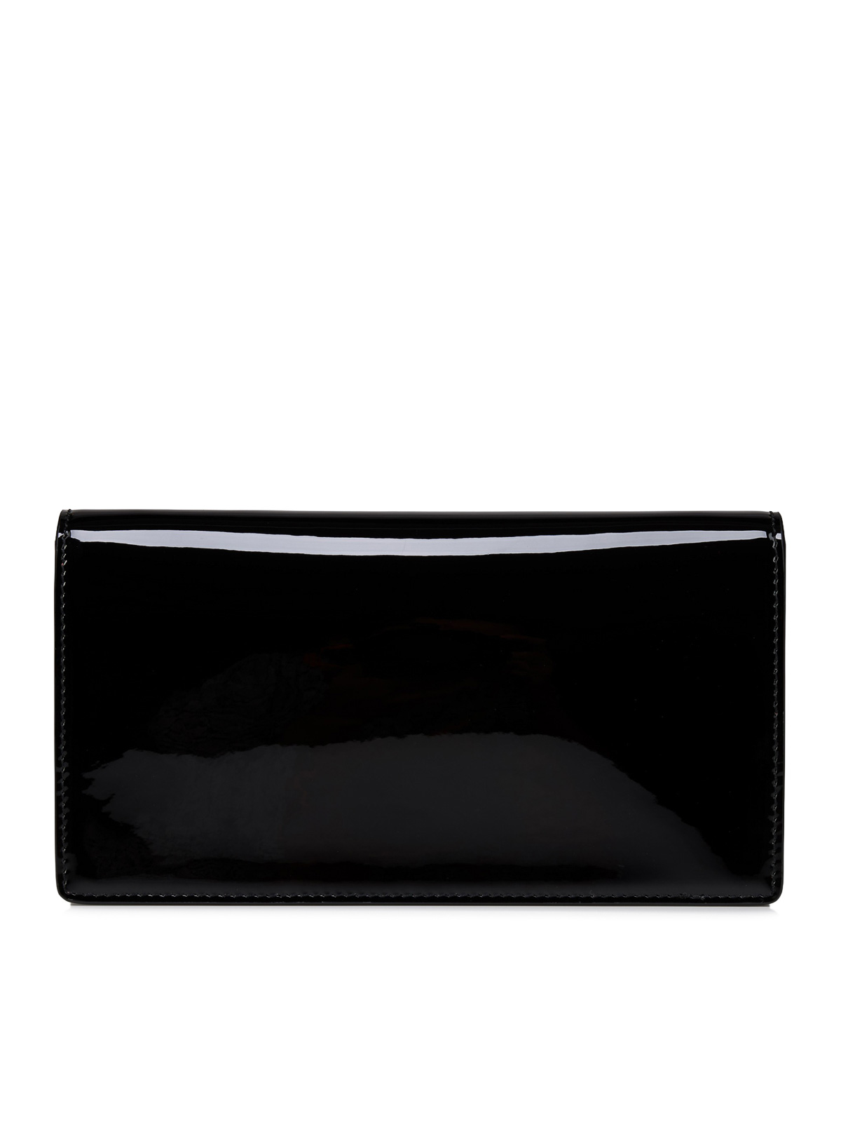 Bettinaパテントカーフスキンクラッチ、前面にゴールドディテール、光沢仕上げのブラックパテントカーフスキン、光沢仕上げ、114 cmチェーンショルダーストラップ、ハンドキャリーまたはショルダーキャリー、マグネットボタンクロージャー、メインコンパートメント1つ、内部フラットポケット1つ、カードスロット3つ、寸法:高さ12 x 幅22 x 奥行き5 cm、色:黒