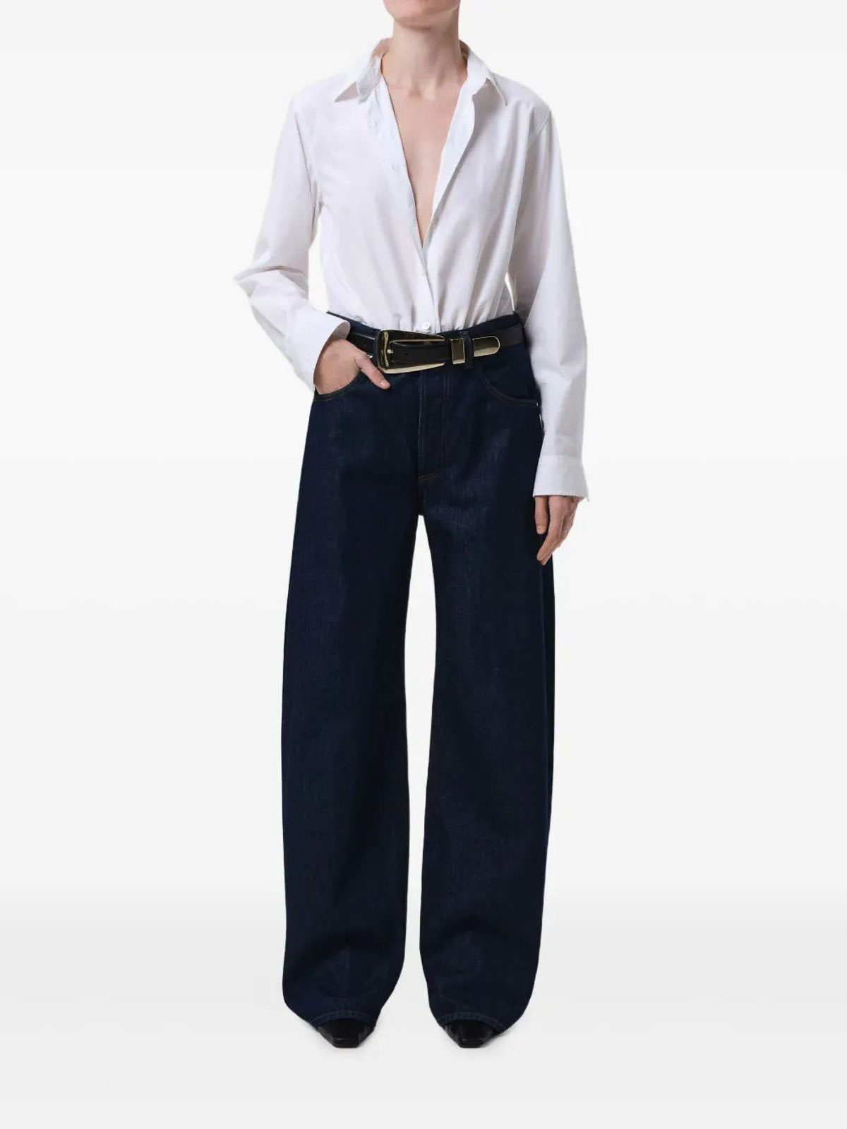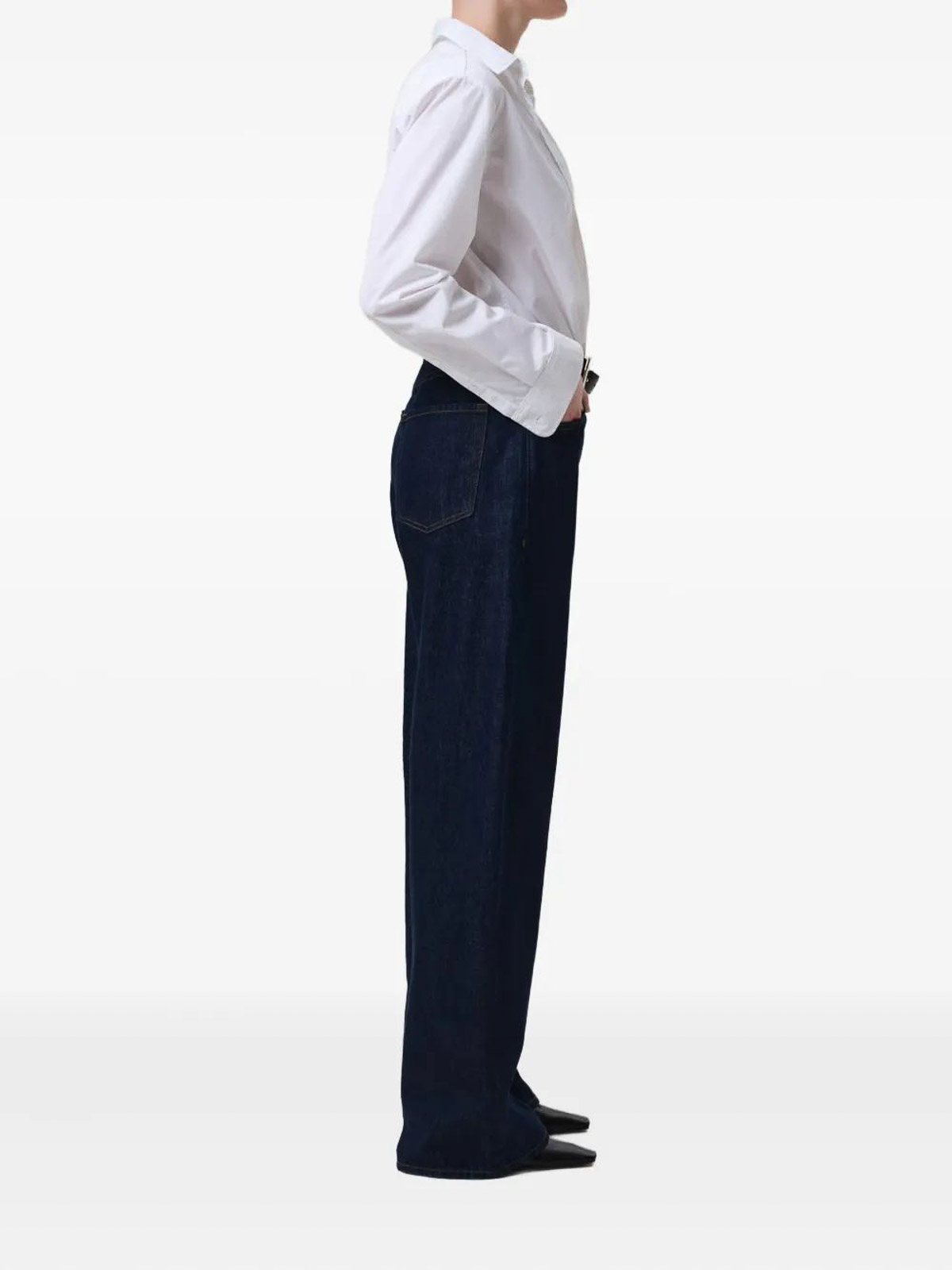 ダークブルー、ワイドレッグ、ストレートヘム、ポケット5つ、ボタンフライ