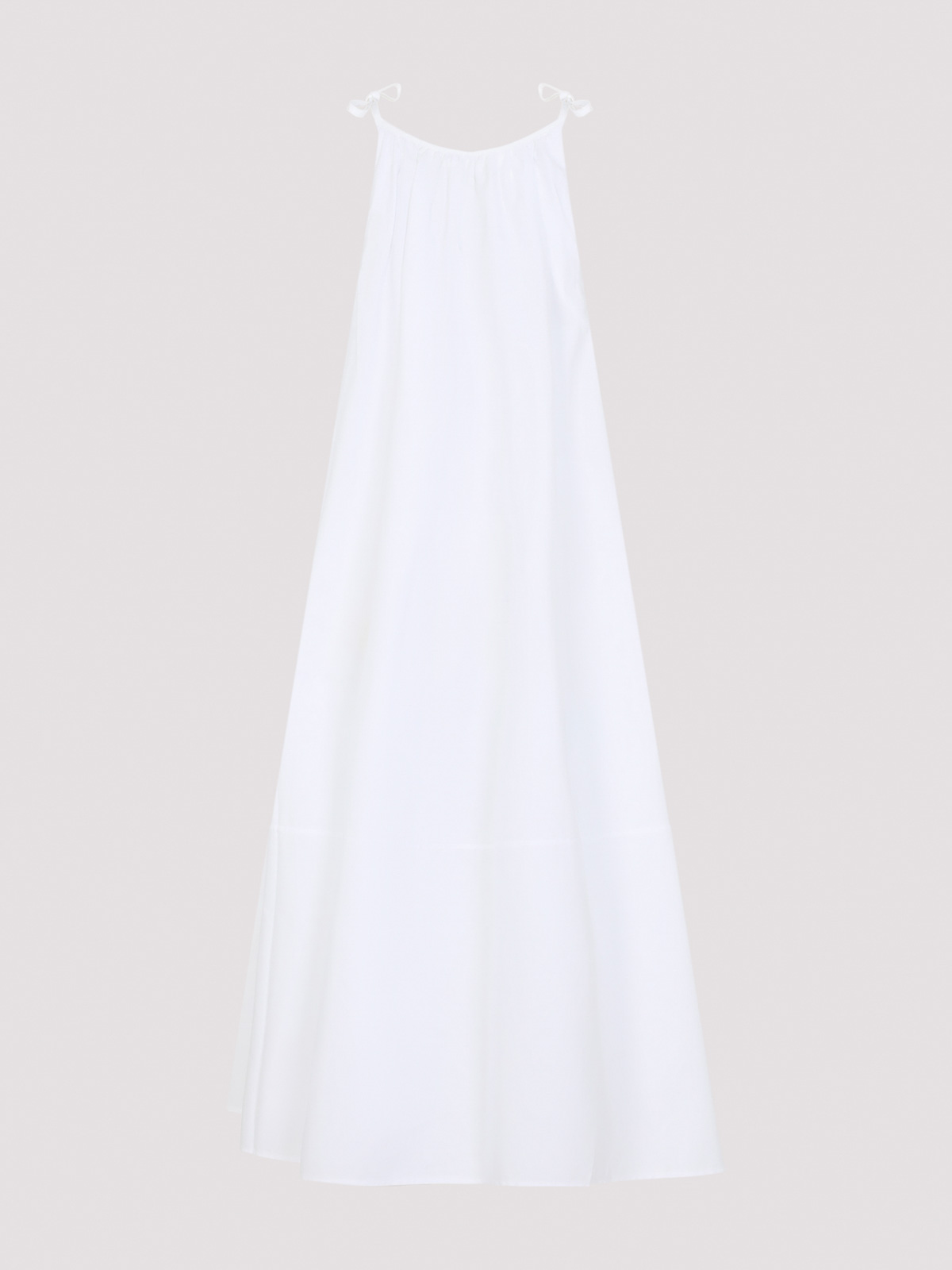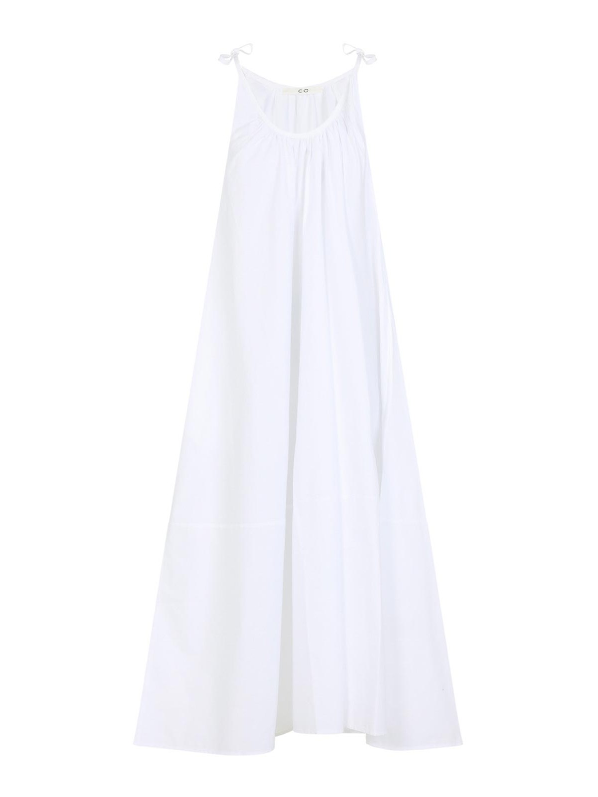 コーギャザーホワイトコットンミディドレス。ホワイトコットンポプリン製のフレアミディドレス。繊細なギャザー効果のある丸いオープンネックラインとセルフタイストラップが特徴です。