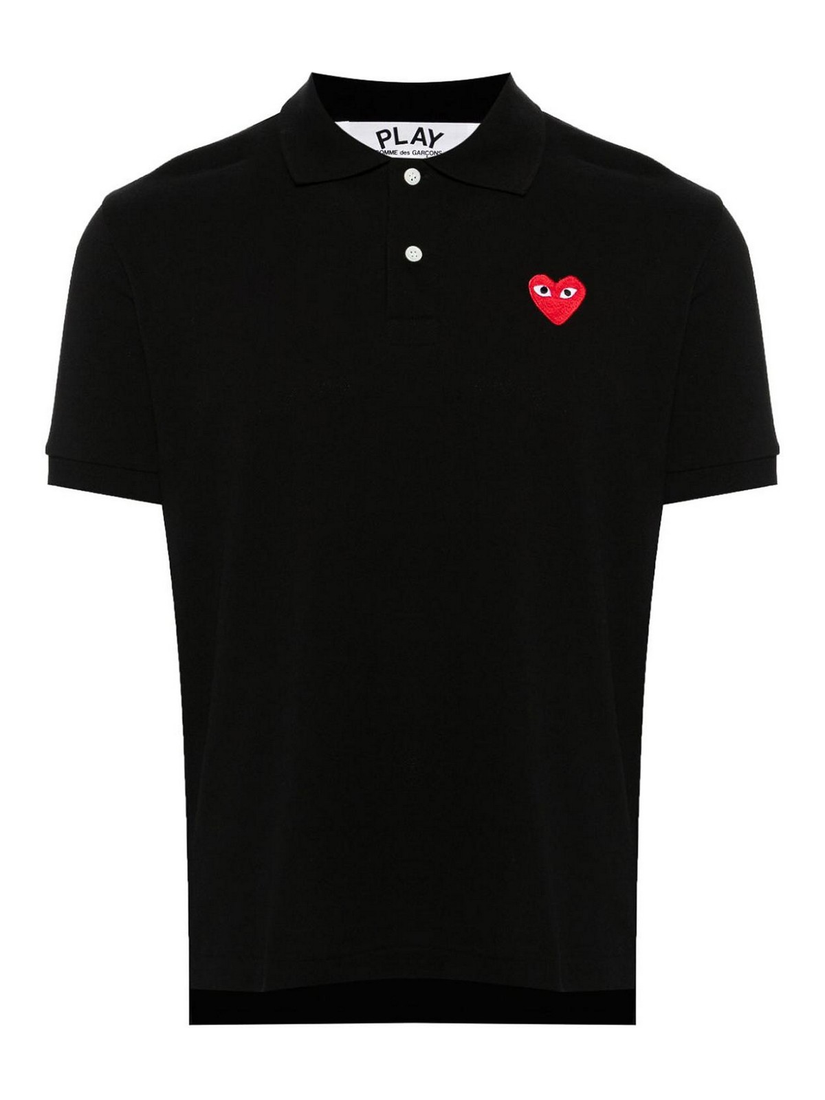 ブラックピク織りのシグネチャーハートパッチ、ポロカラー、ボタンプラケット、半袖、リブ編みの袖口、短いサイドスリット、ストレートヘム、ご購入時