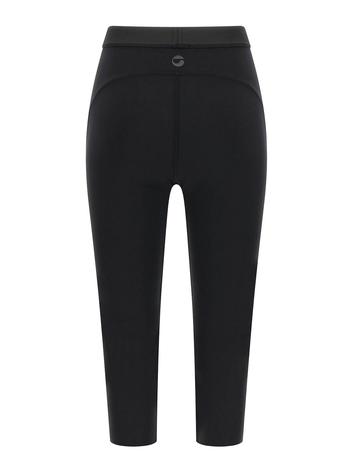 伸縮性のあるコンパクトな生地のサイクリングカプリレギンス。ウエストバンド、ポケット、バックロゴプリント付き。
