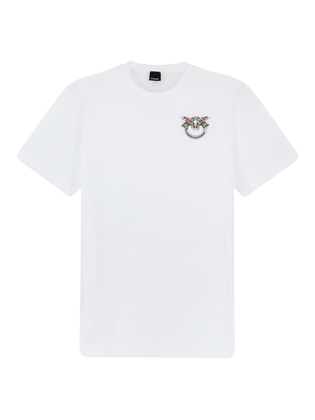 クルーネック、ショートスリーブ、リブ編みのプロファイル、ラインストーンロゴ、100% コットン。