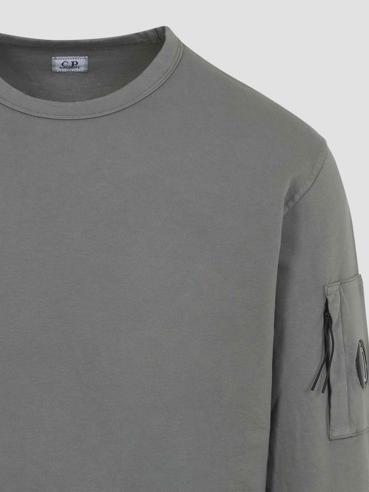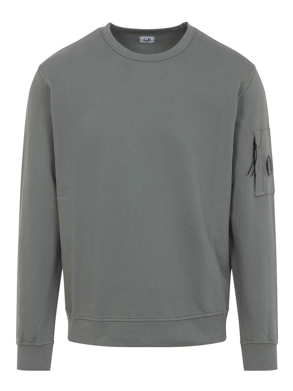 Cp Companyのグレーコットンスウェットシャツ。グレーの起毛コットン製、ラウンドネック、長袖、袖にレンズのディテールが施されたジッパーポケット、細かいリブ編みのエッジ、ストレートヘム。
