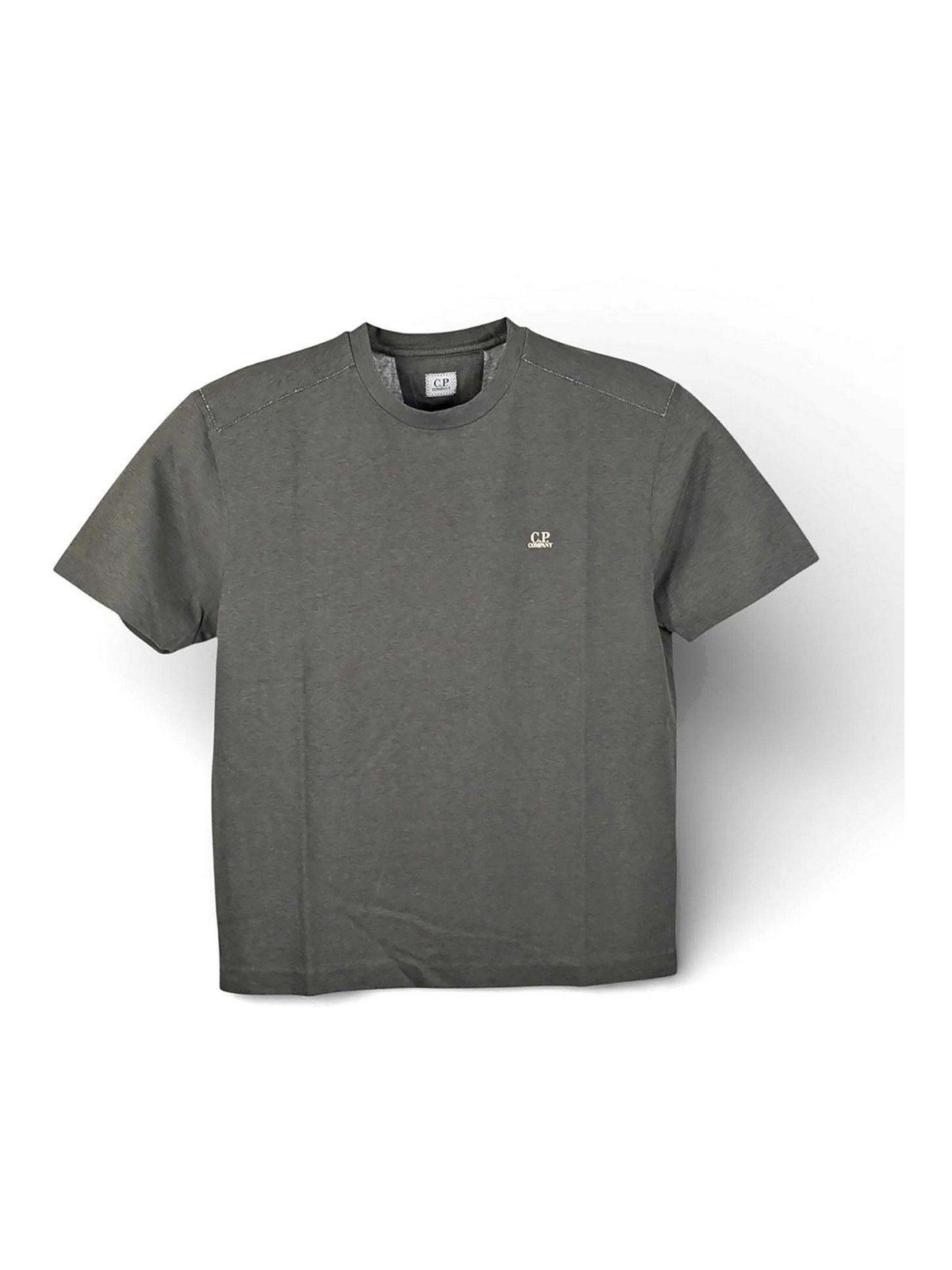 C.P. 社、20/1ジャージーメッキのロゴTシャツ、20/1メッキのコットンジャージーTシャツ、グレー、20/1メッキのコットンジャージー製の半袖Tシャツ。ツートン効果を生み出す両面構造が特徴の生地。素材の右側にフルプリントを施してツートンカラー効果を得た後、酵素洗浄を施すことで手を柔らかくし、衣服に古びたような外観を与えます。レギュラーフィット感。クルーネック、胸にロゴプリント、背中にコントラストの効いたステッチが特徴で、ディテールがより引き立ちますテクニカルな作りとコンテンポラリーなアイデンティティ。20/1メッキのコットンジャージー、両面ツートン調構造、酵素ウォッシュ、クルーネック、胸にロゴプリント、背面にコントラストステッチ、レギュラーフィット。