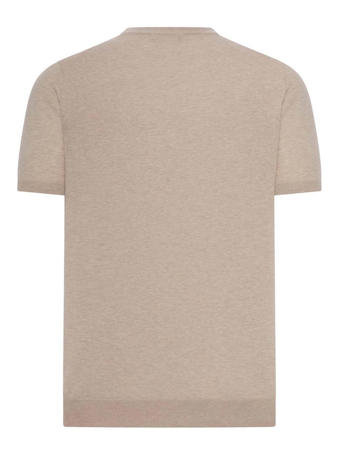 上質で均一な質感の軽量ニットTシャツ、リブ編みのクルーネック、リブ編みの袖口付き半袖、リブ編みの伸縮性のある裾、トーン・オン・トーン仕上げ、ヘザー効果、レギュラーフィット、100% コットン、色:ホワイト/ベージュ