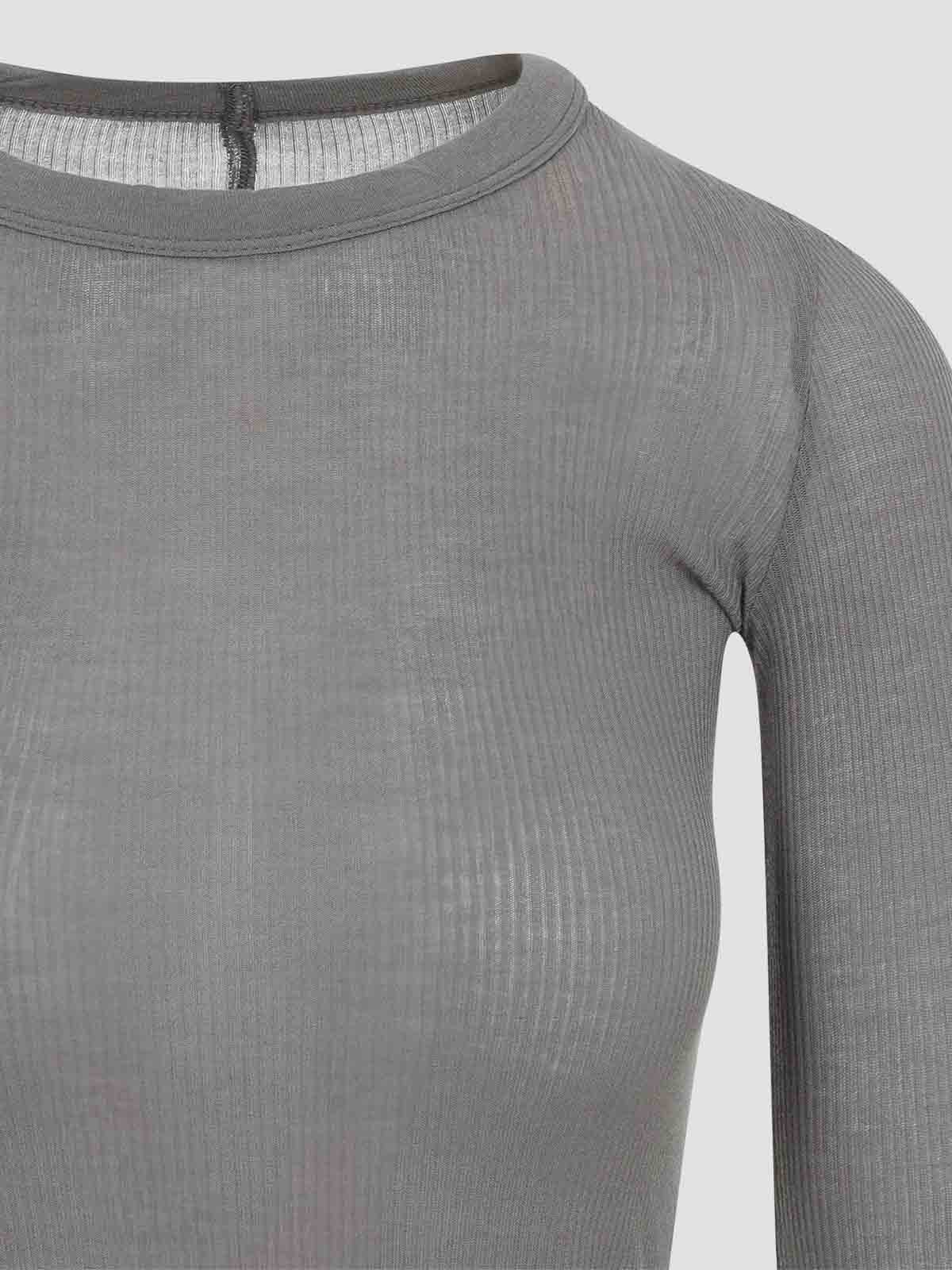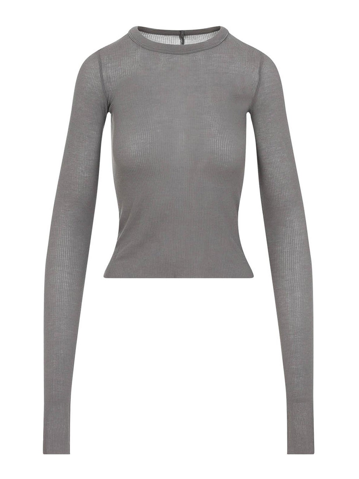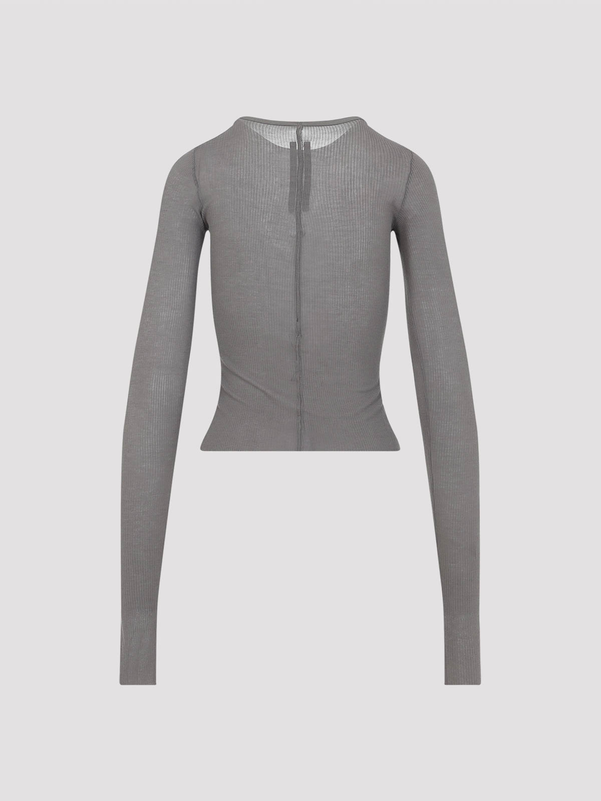 リック・オウエンスのクロップドリブ LS ブラウンビスコースTシャツ。リブ編みのライトウェイトブラウンビスコースとシルクを使用したロングスリーブトップ。ラウンドネック、背中のアイコニックな中央トップステッチ、スリムフィット、クロップド丈が特徴です。