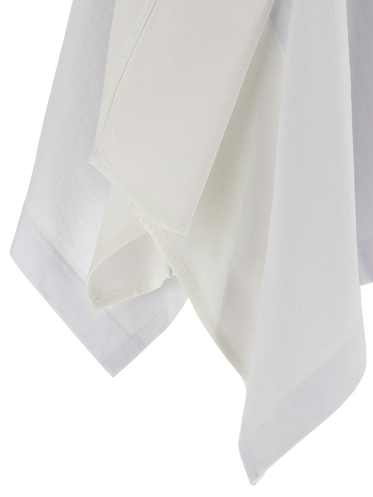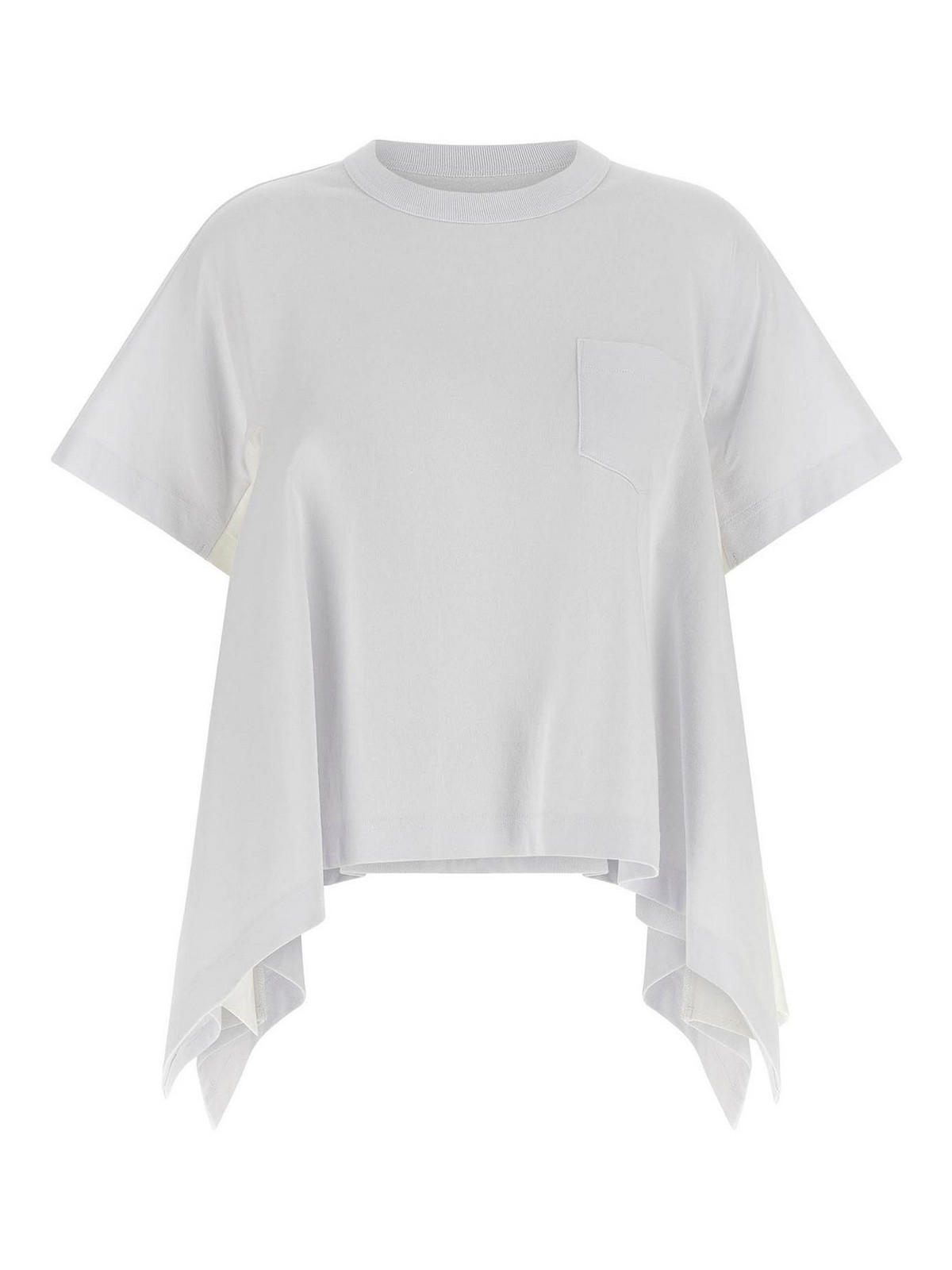 トーン・オン・トーンのガーメント染めコットンデニムのサイドインサートをあしらったコットンジャージーTシャツ。胸ポケット、クルーネック、ショートスリーブ、アシンメトリーな裾が特徴です。