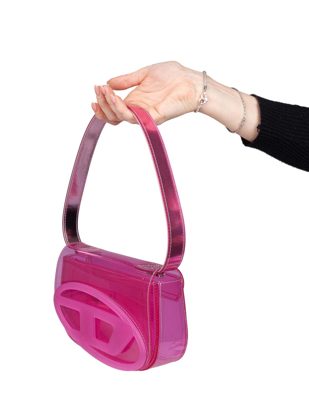 フレキシブルTPU製のディーゼルバッグ。色付きの鏡面ゼリー効果仕上げ。アクセサリーとコーディネートされた小物と分厚いチェーンが付いた楕円形の飾り板。ビスケットのロゴがプリントされたドローストリング付きの内部ポーチとしても機能します。フラップの下には調節可能で取り外し可能なマグネットチェーンが付いています。