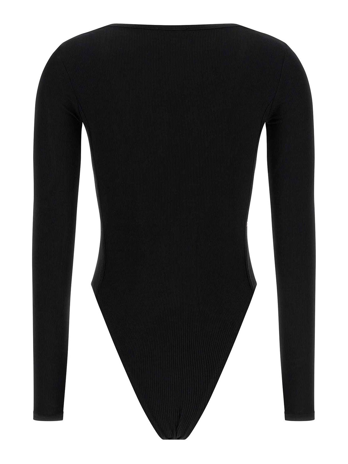 エコヴェロストレッチビスコース混紡のT-bodyn' ボディスーツ、サイドロゴパッチ、フロントにワイドなラウンドネック、ロングスリーブ、ハイレッグのトングカバー、裾にスナップボタン。