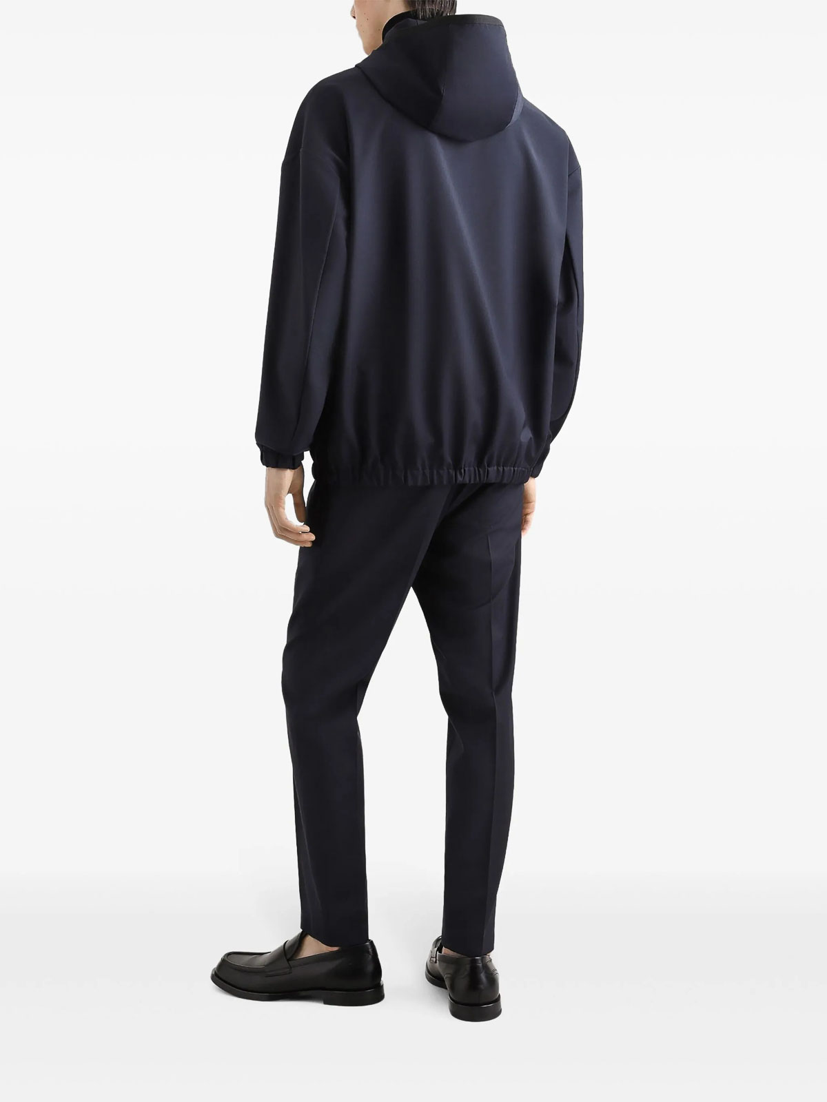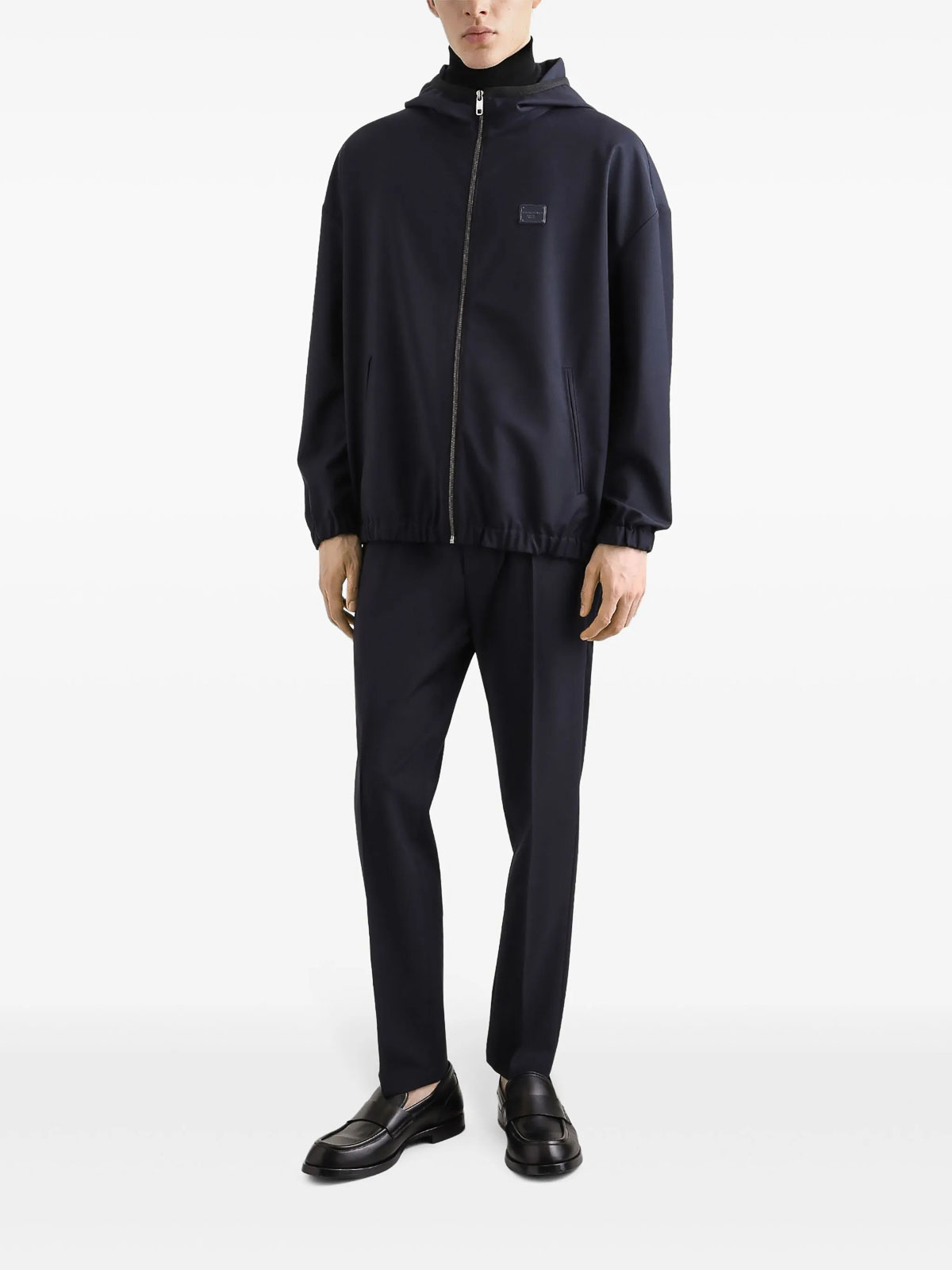 デザイナーカラー:ベリーダークブルー、ウール、ルーズフィット、ロングスリーブ、クラシックフード、ジッパー留め、ストレッチウエストバンドとカフス、フロントウェルトポケット2つ、インナーポケット2つ、フロントにロゴパッチ、裏地付き。