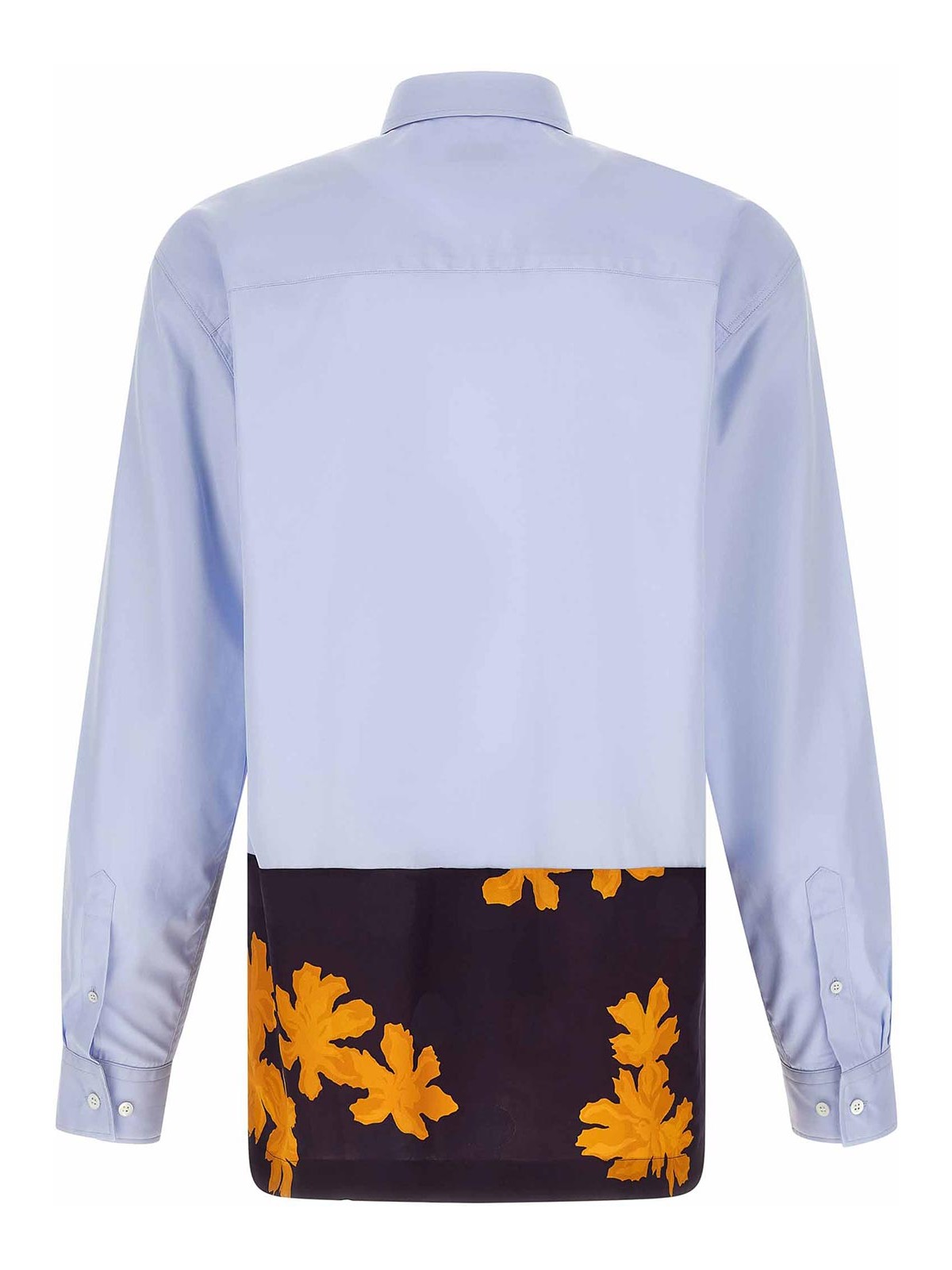 カペロコットンポプリンシャツ、フロントボタン留め、ロングカフスリーブ、裾に花柄をあしらった光沢のあるビスコースバンド。