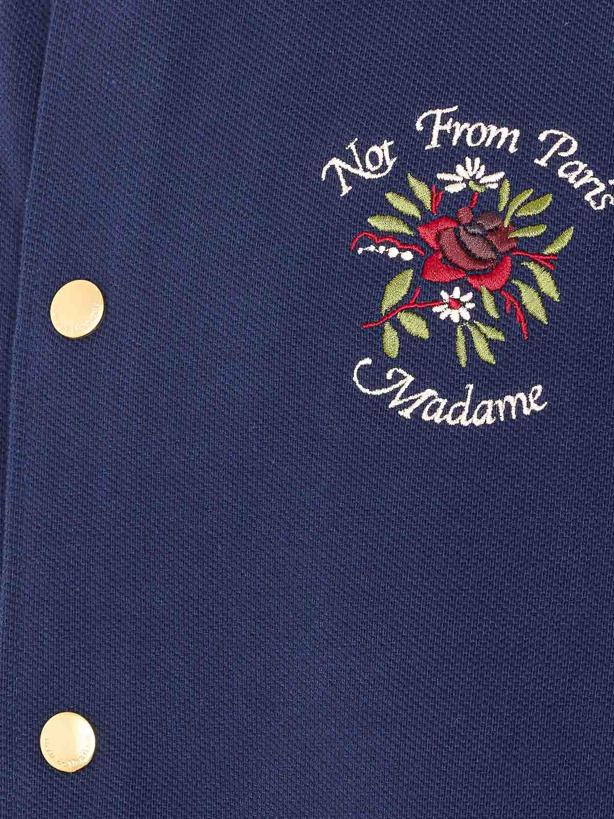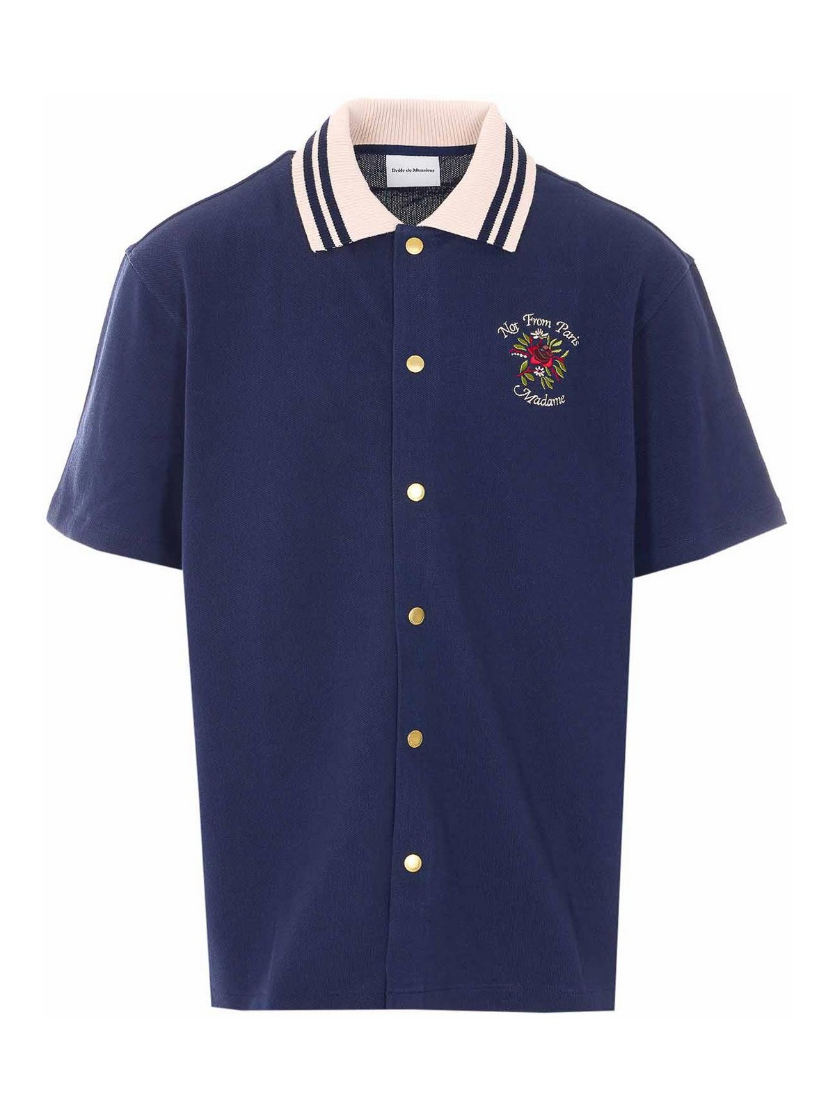 Drole de Mussieur ブルーシャツ、フロントボタン留め、レギュラーカラー、ショートスリーブ、前面と背面にロゴ刺繍