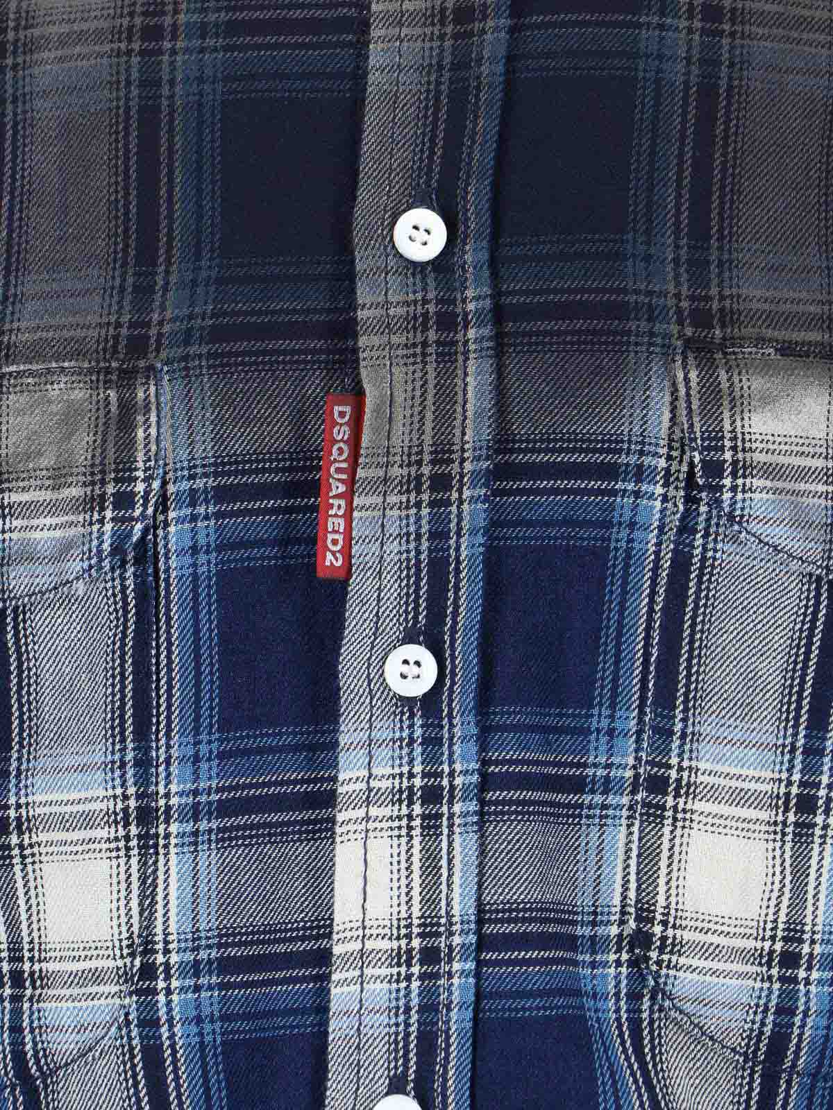 ブルーコットンのDsquared2チェックシャツ、全面チェック柄、襟、長袖、フロントボタン留め、フロントに使い古したディテール、フロントボタンフラップポケット2つ、フロントにコントラストの効いたロゴタグ、ボタン付きカフス、カーブした裾。