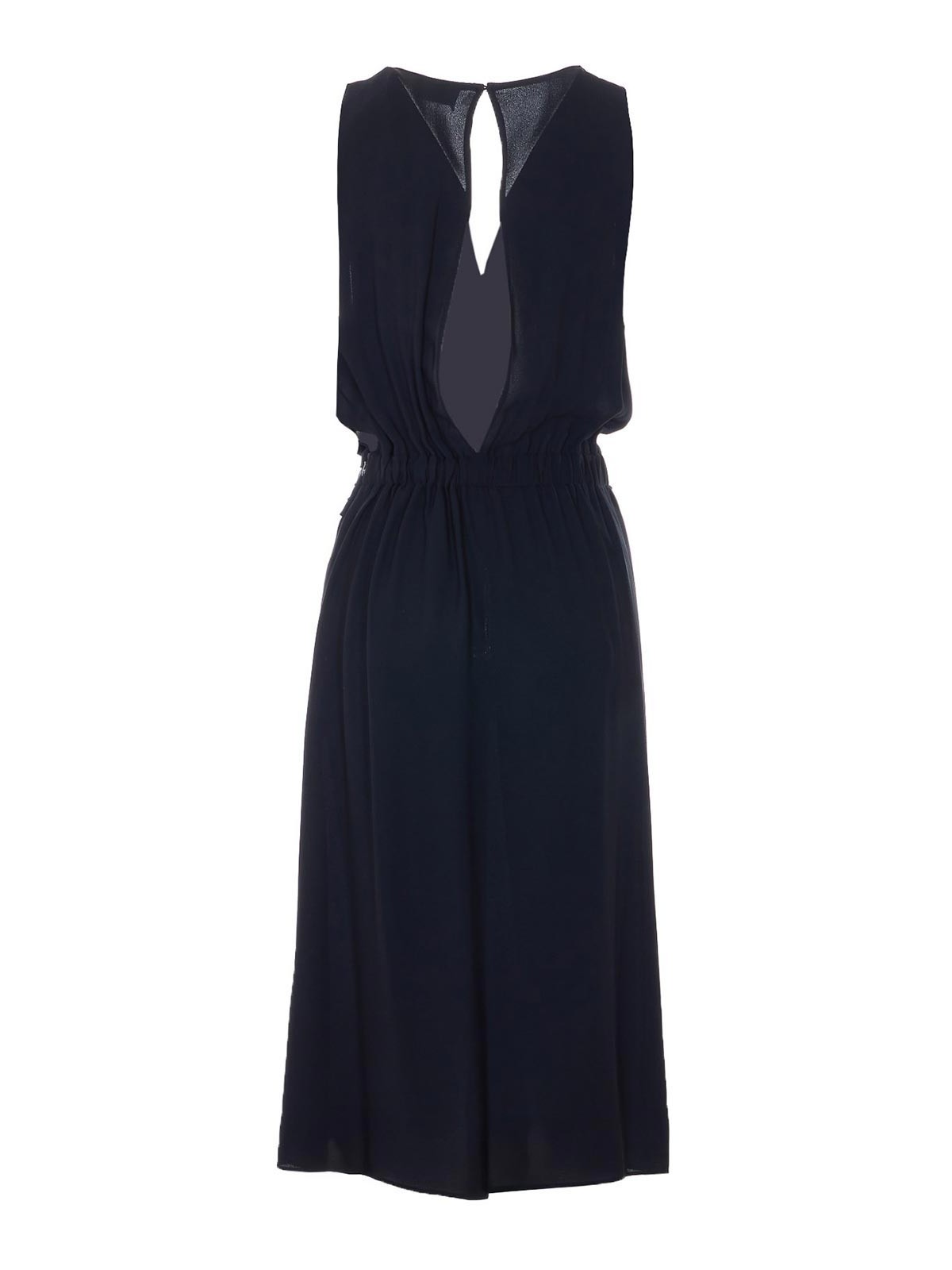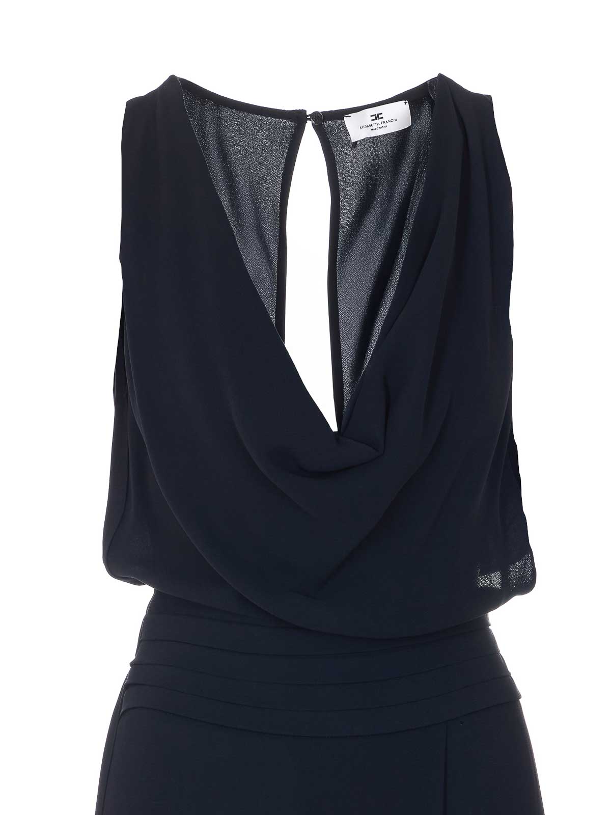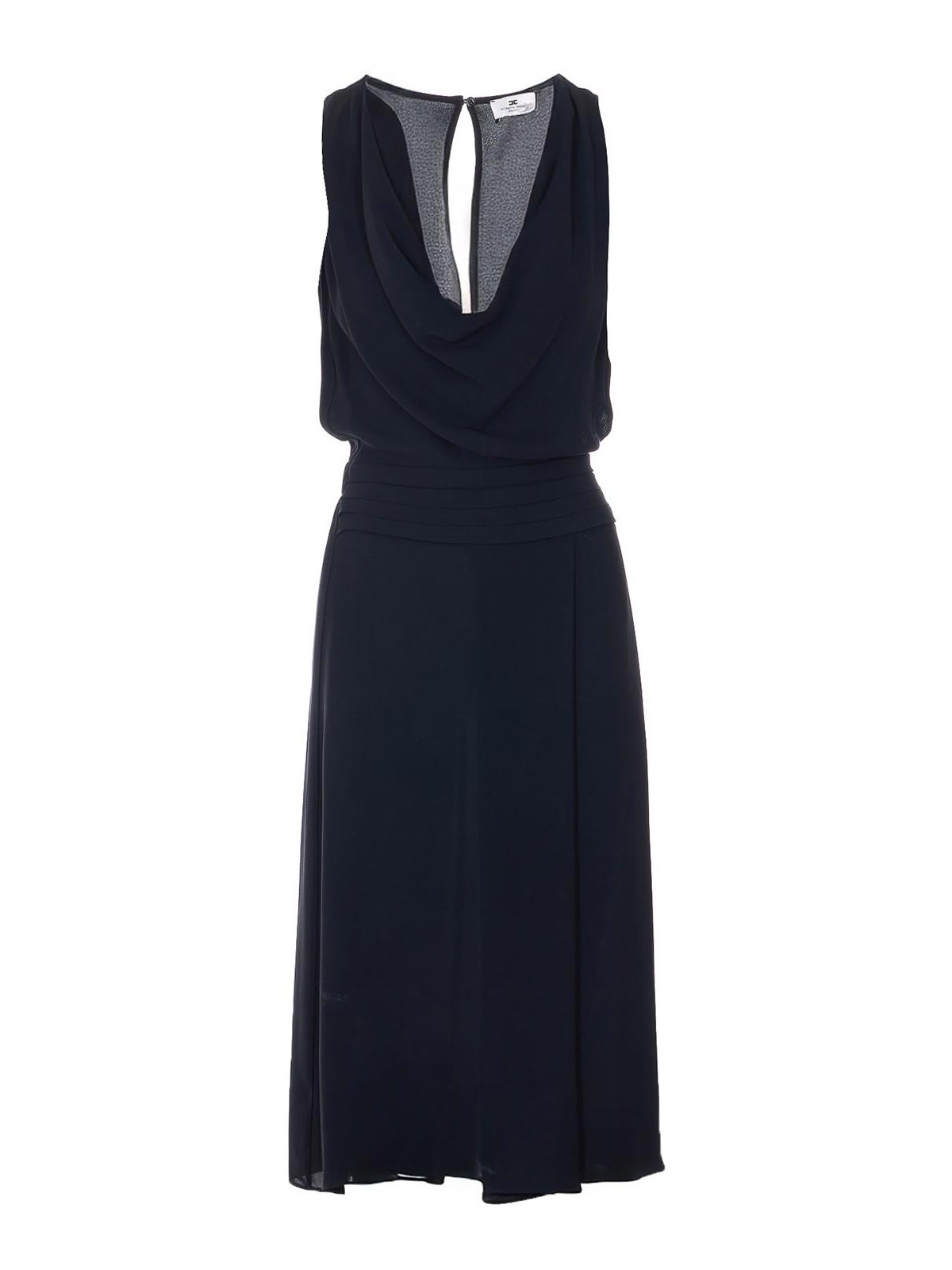 Elisabetta Franchi ブラックドレス、サイドファスナー開閉、背面にボタン、背面にカットアウトディテール、ノースリーブ、ミディモデル