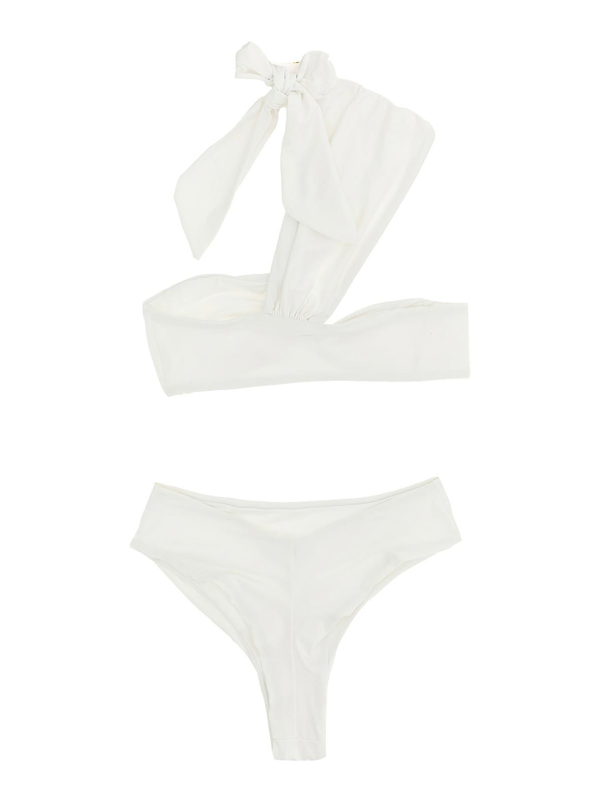 ライクラビキニ、胸にクロスバンドが付いたワンショルダートップ、ハンマー加工の質感のメタルジュエルディテールで首の後ろにひもで結ぶ、ハイウエストボトム。