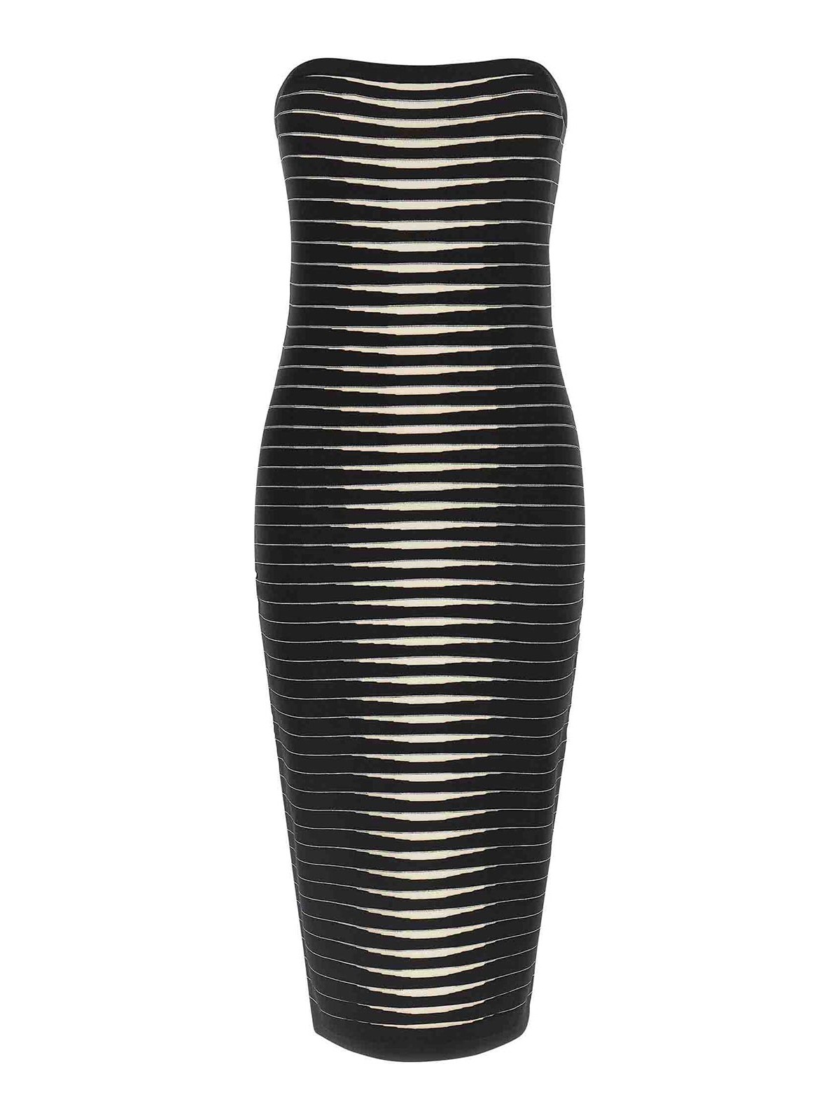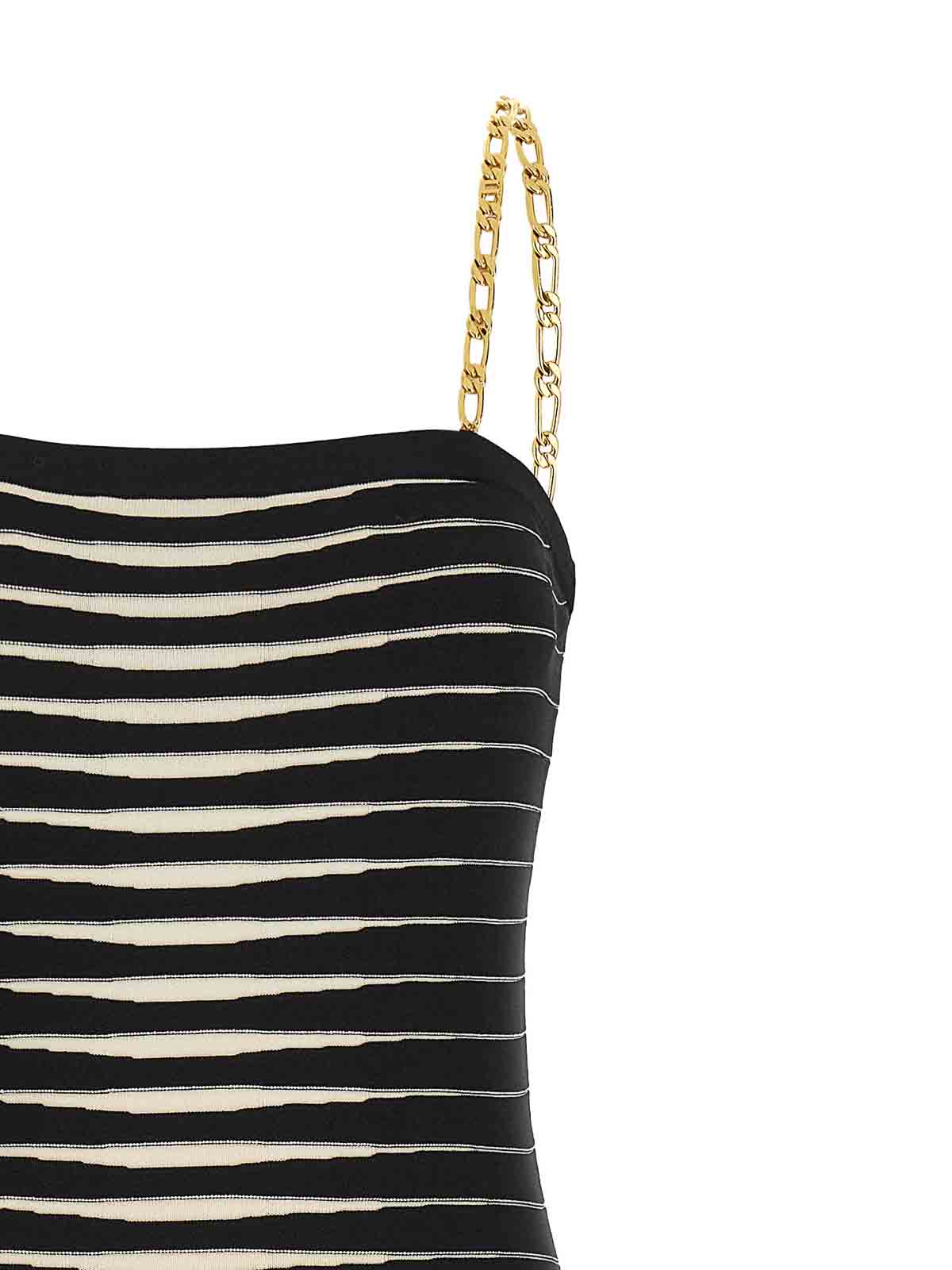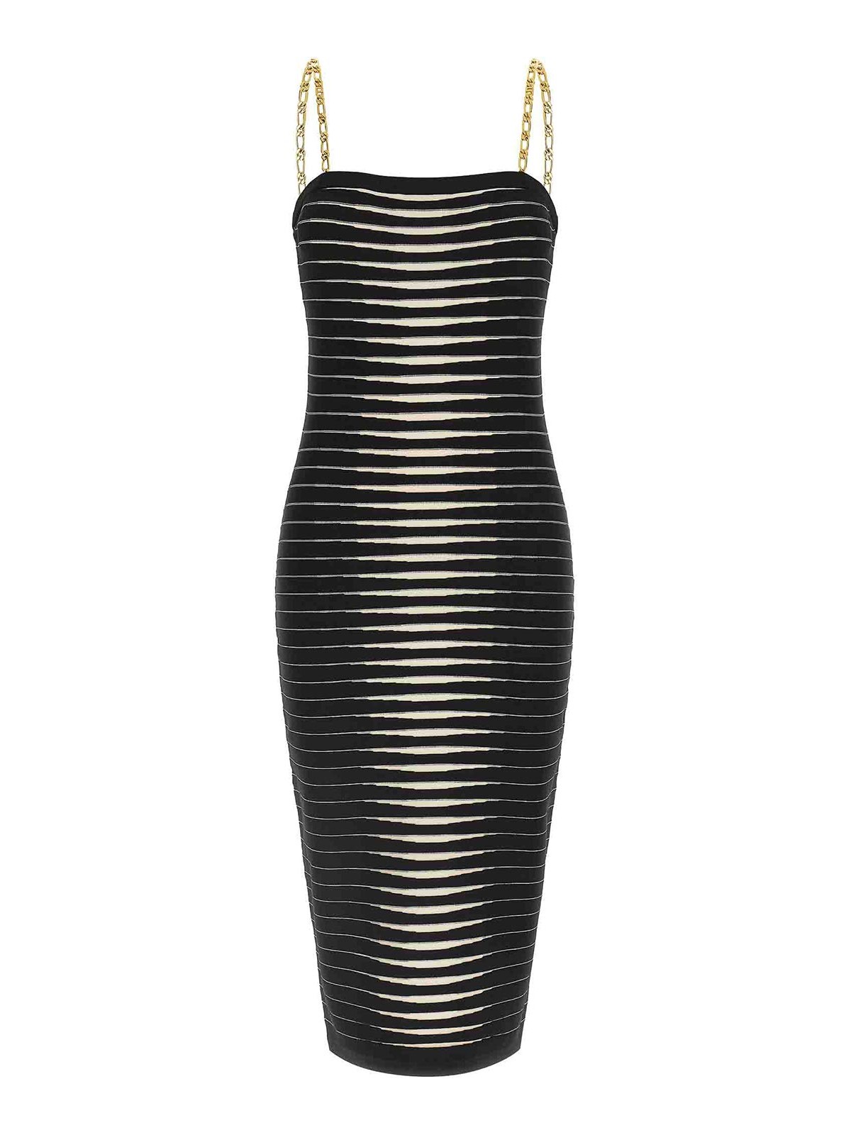 ストライプ柄のドグラードゼブラ効果を再現したジャカード生地のミディドレス、オフショルダーのバンドーモデル、取り外し可能なメタルチェーンブレース、ノースリーブ。