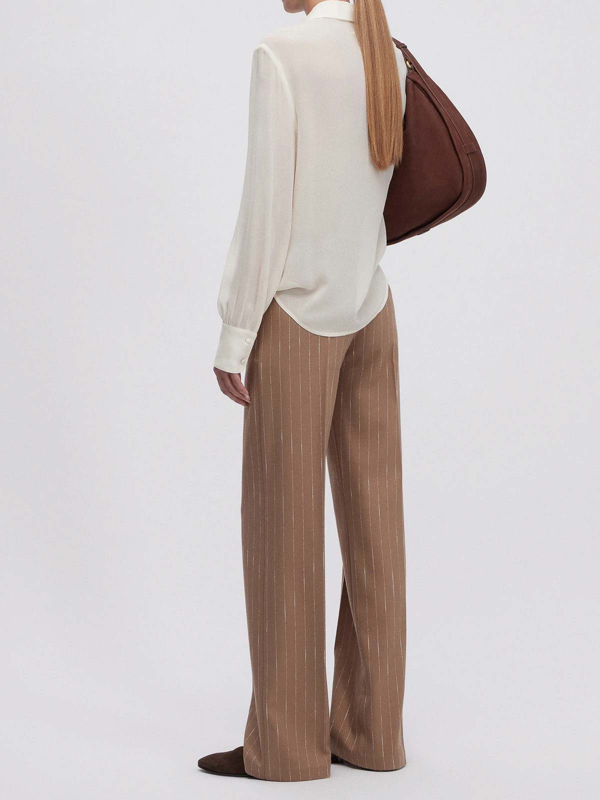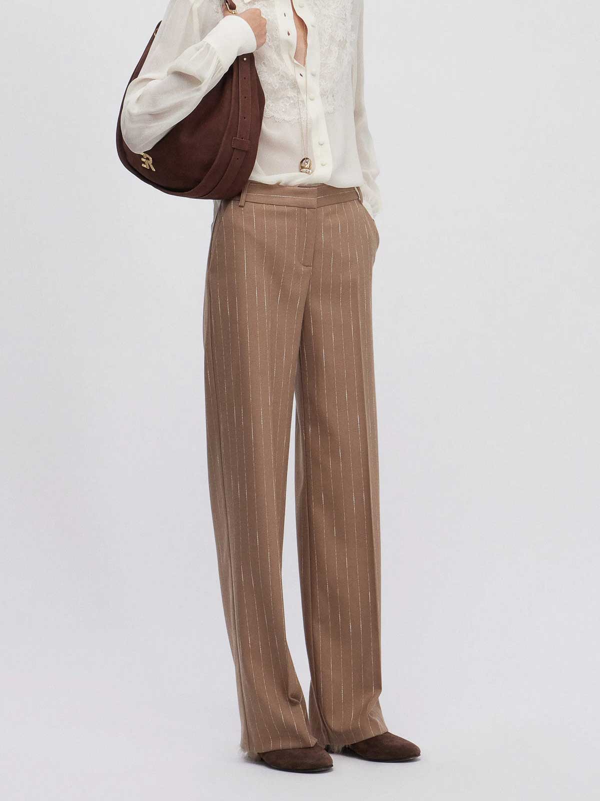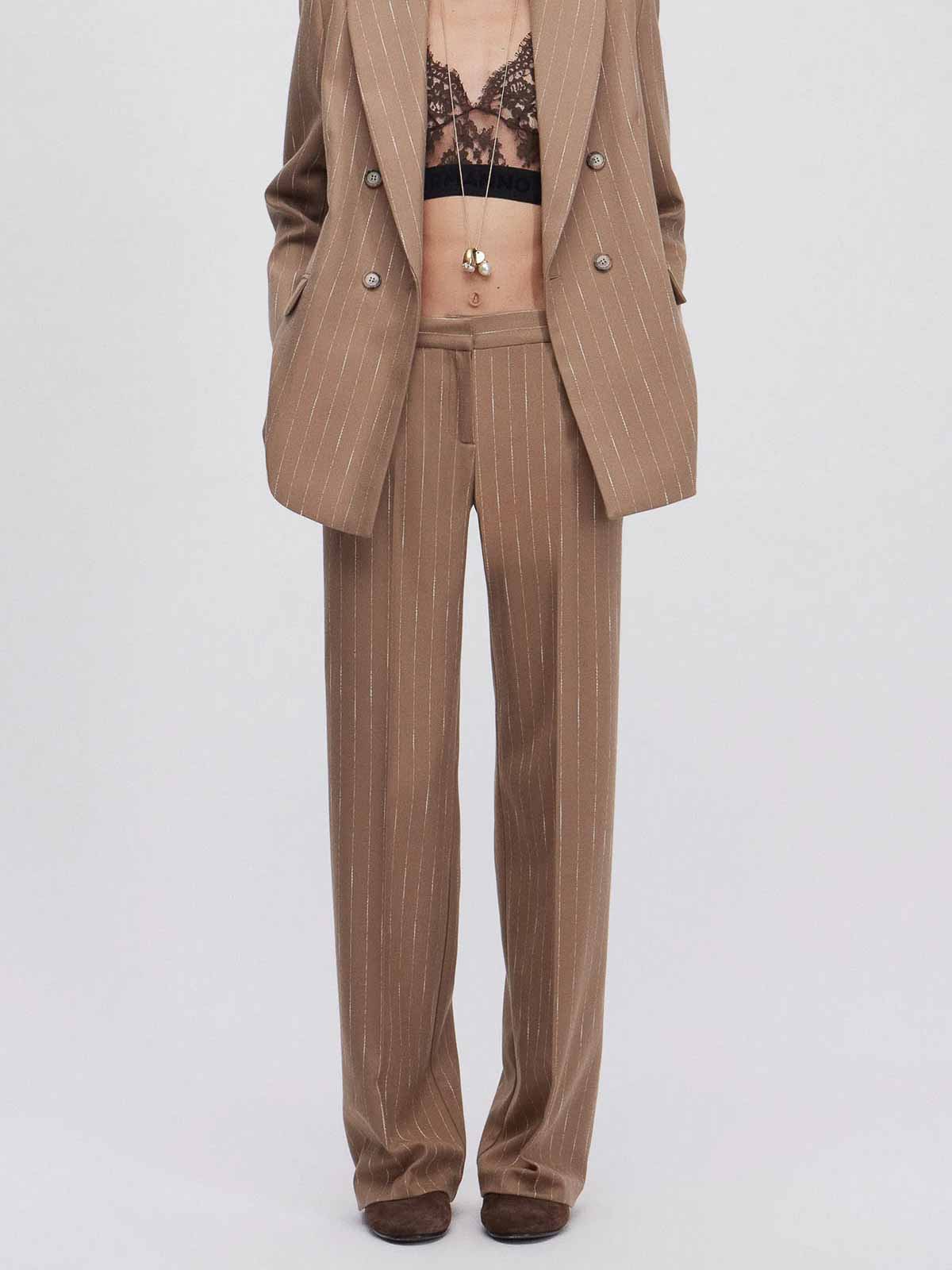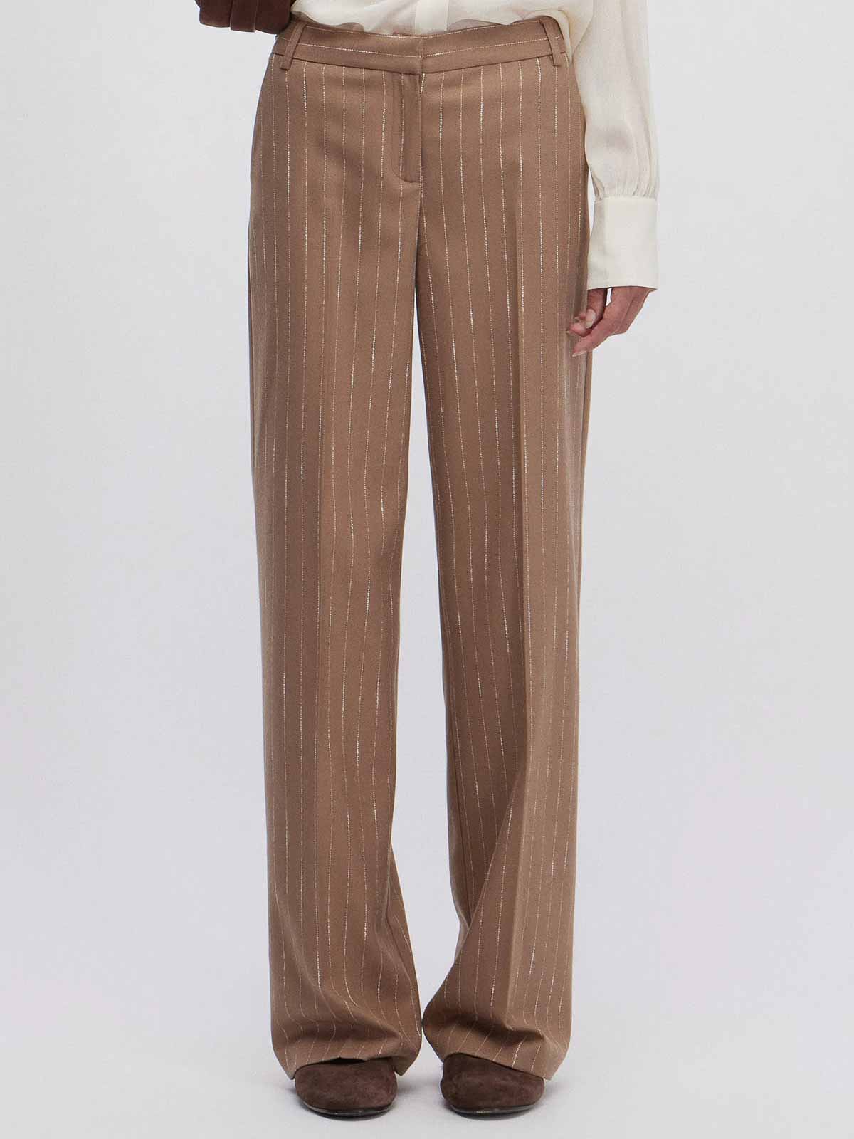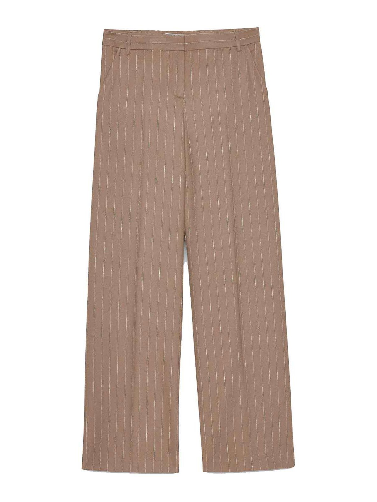 ソフトキャメルとオフホワイトのピンストライプ生地のストレートレッグスタイル、ベルトループ付きウエストバンド、内側にフックとジッパー付き、サイドポケット、プレス加工の折り目。組成 63% pl 32% vi 3% co 2% ea
