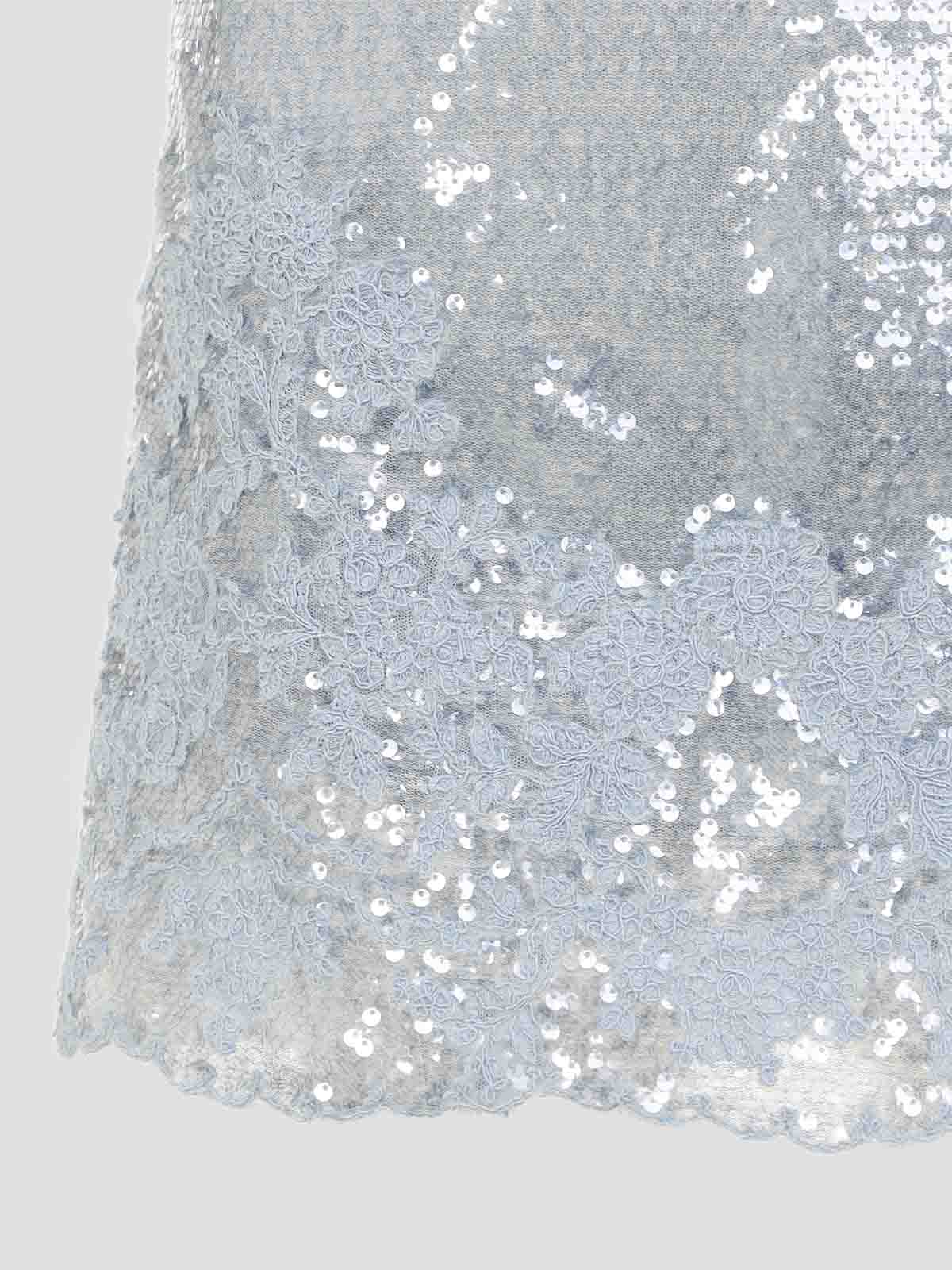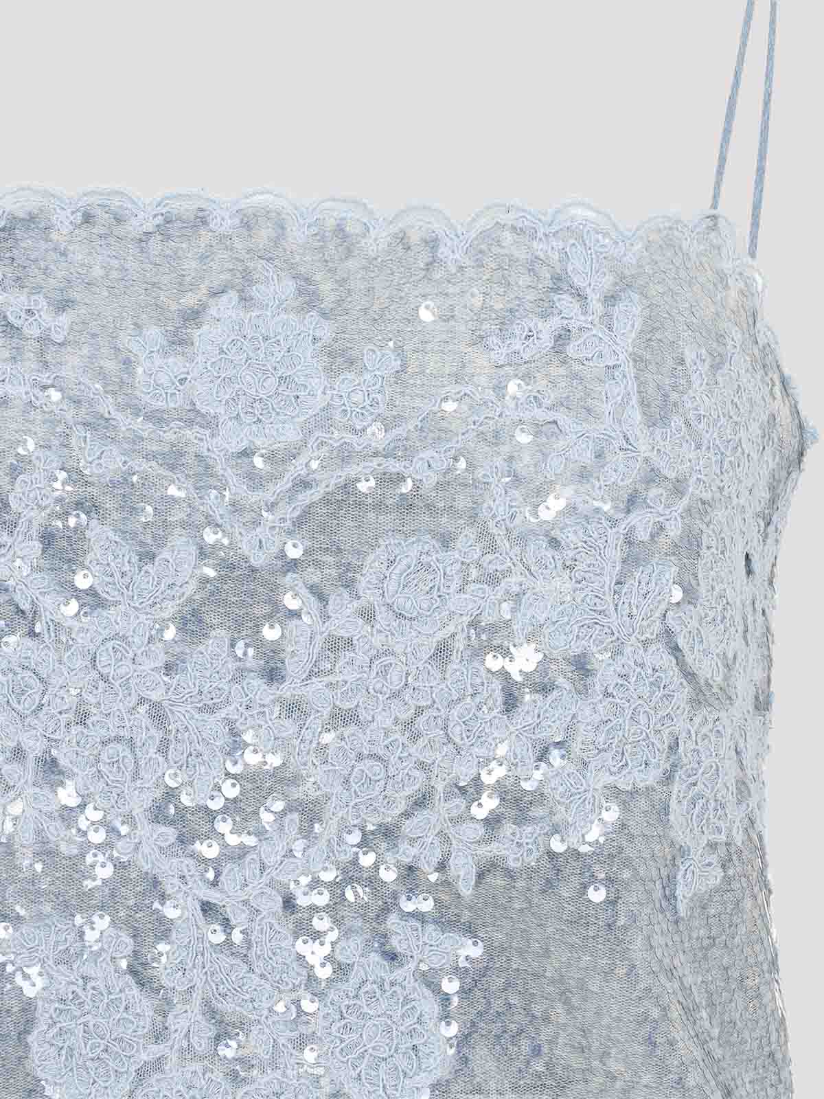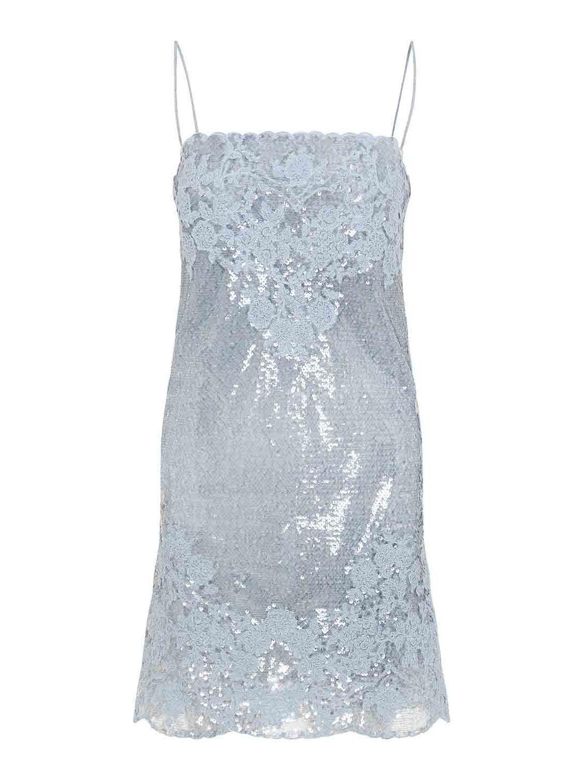 Ermanno scervino ライトブルーのポリエステルミニドレス。ライトブルーのスパンコールで作ったミニドレス。同系色のレースのアクセント、ストレートなネックライン、細いストラップ、スカラップヘムが特徴です。