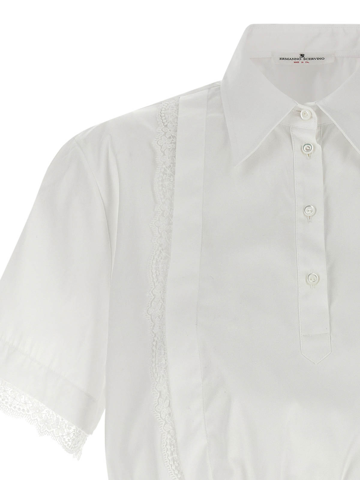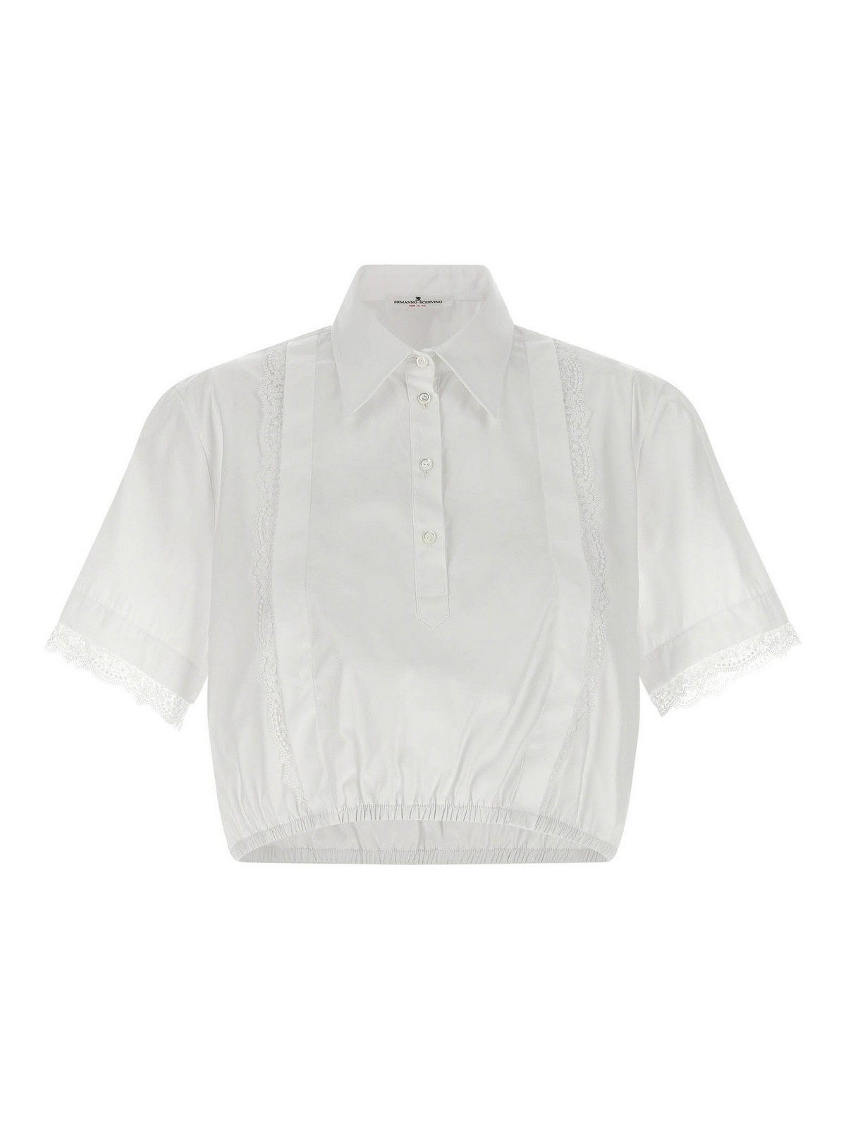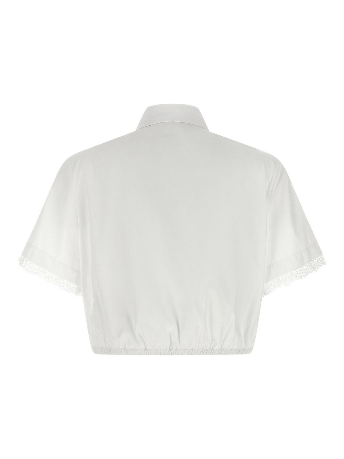 コットンポプリンシャツ。トーン・オン・トーンのレースインサート、クロップモデル、襟、ボタン、ショートハンド、カフス、裾にゴム入り。
