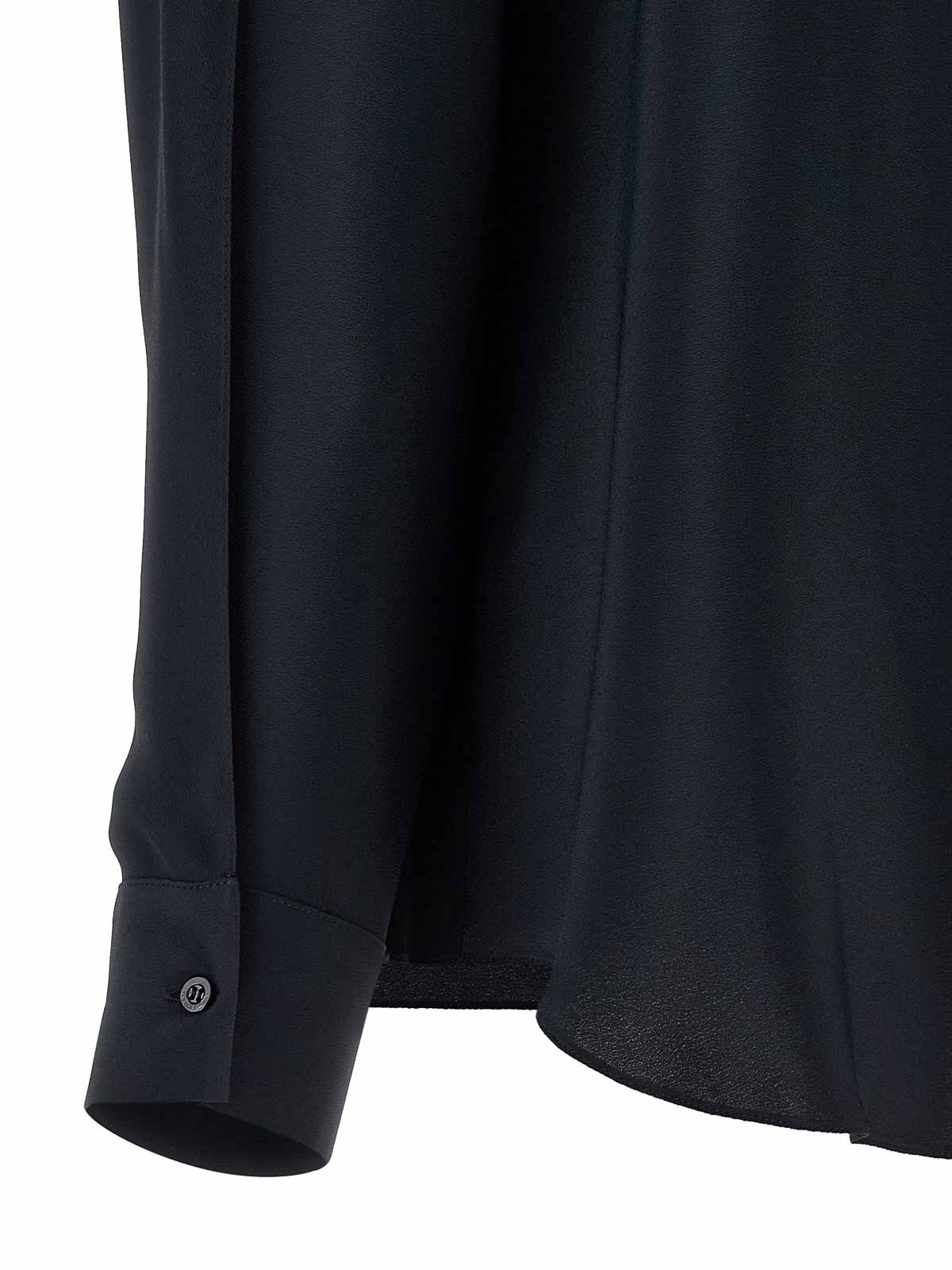 シルク混紡クレープシャツ、「カットアウト」のディテールが施された襟と袖、隠しボタン付きのフロントクロージャー、カフス付きのロングスリーブ。