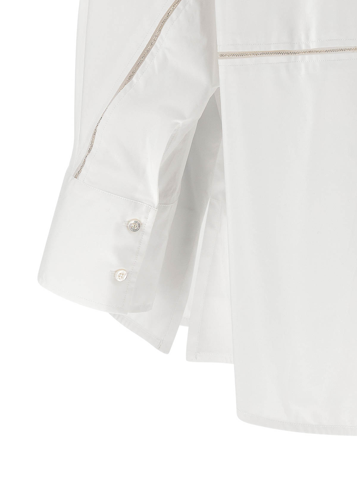 バックチュールとダイヤモンドスレッドのインサートをあしらったコットンポプリンシャツ、隠しフロントボタン留め、カフスとドロップショルダー付き七分袖、サイドスリット、アシンメトリーヘム。