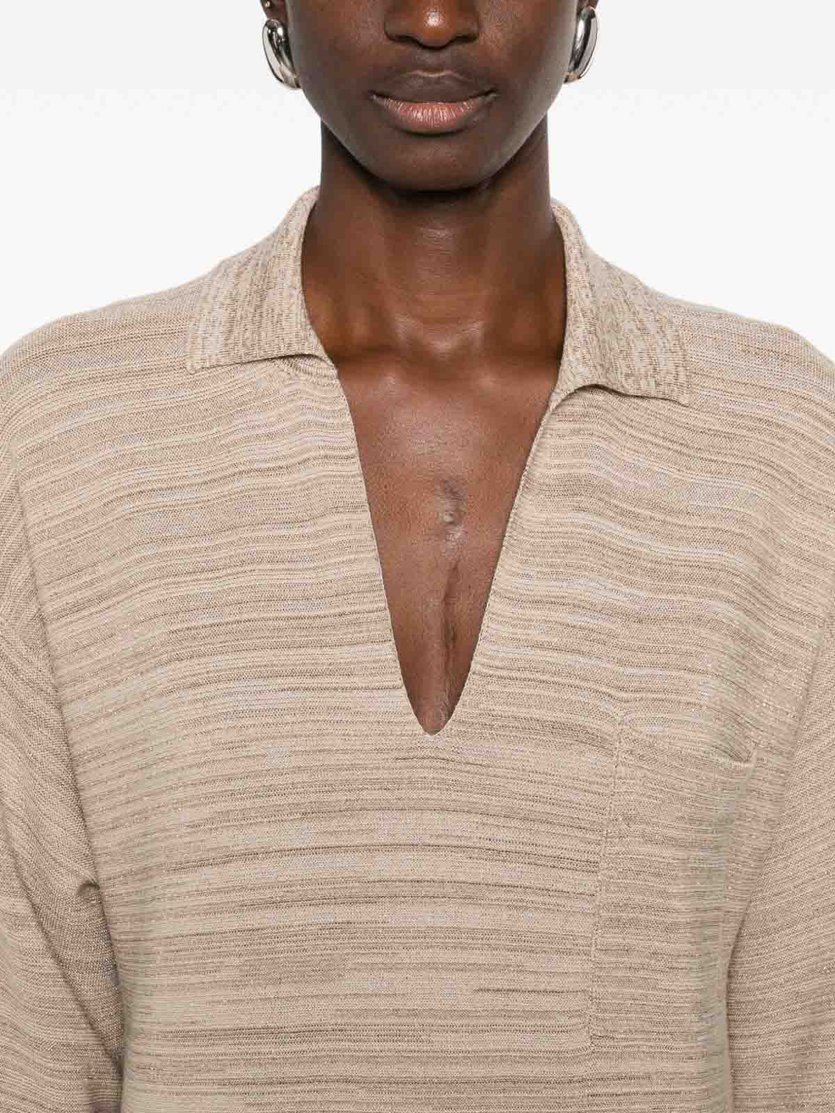 ベージュ横ストライプ Vネック胸ポケットポロカラー半袖