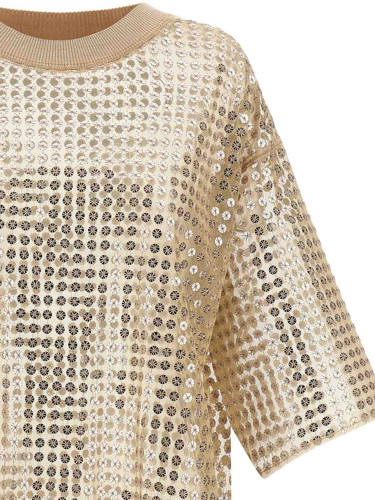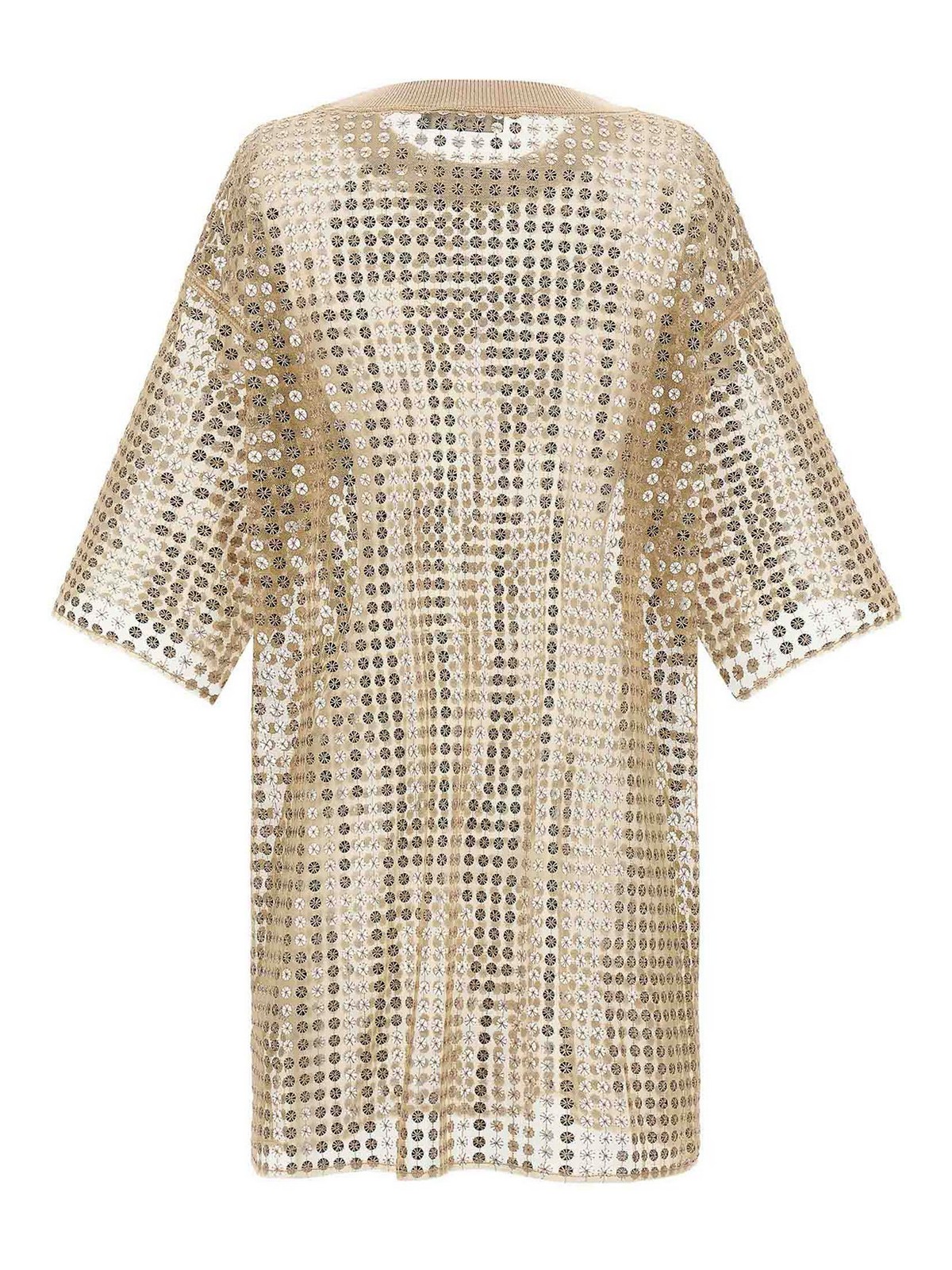 半透明メッシュのミニドレス。全体にトーン・オン・トーンのスパンコールをあしらい、クルーネック、ショートスリーブをあしらいました。
