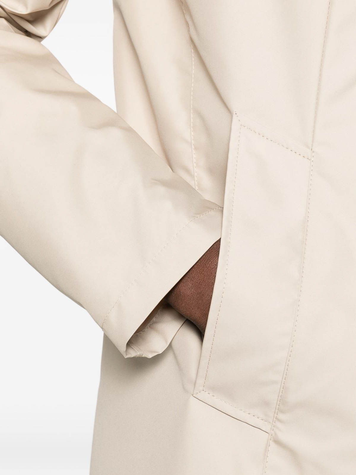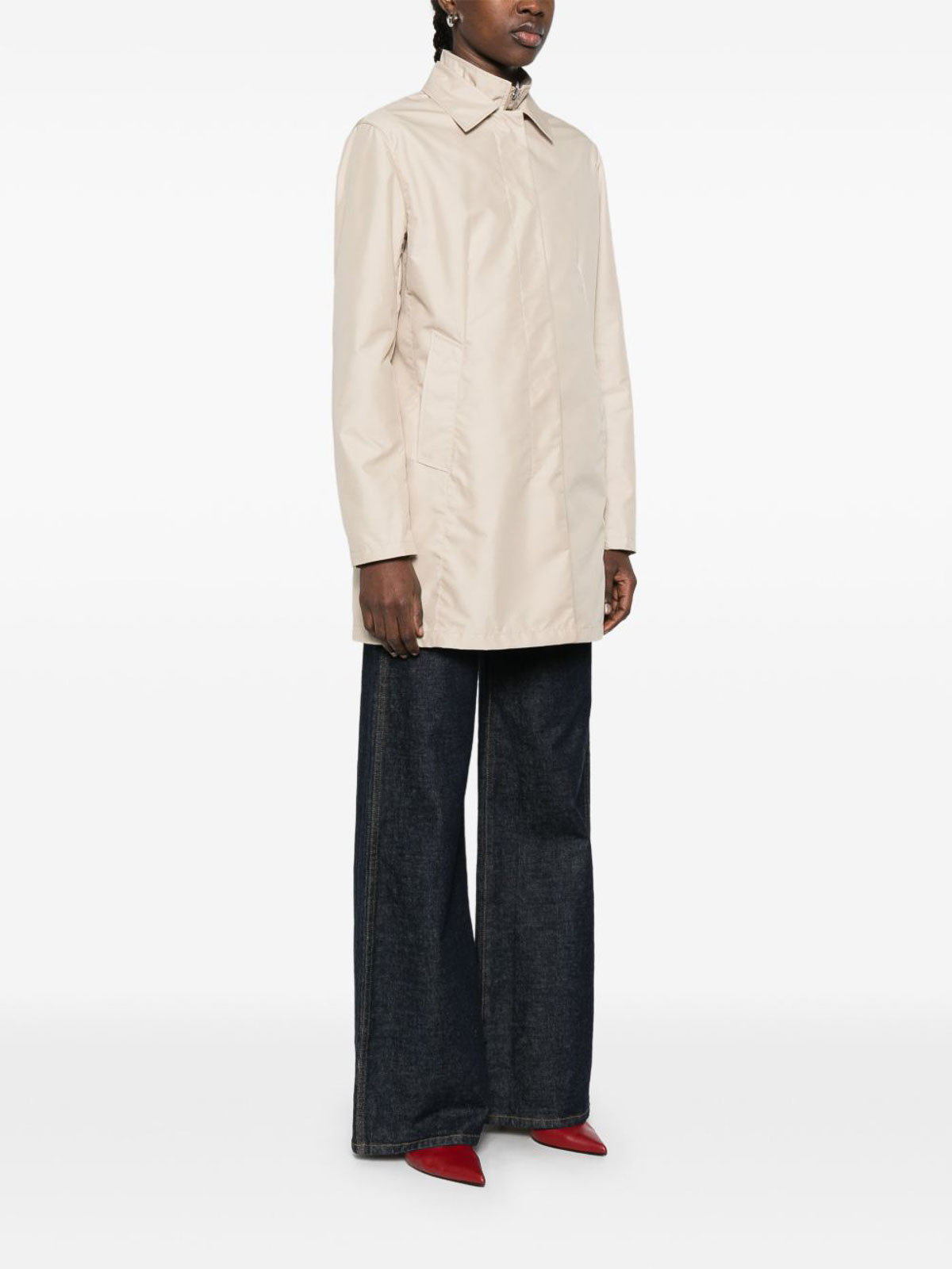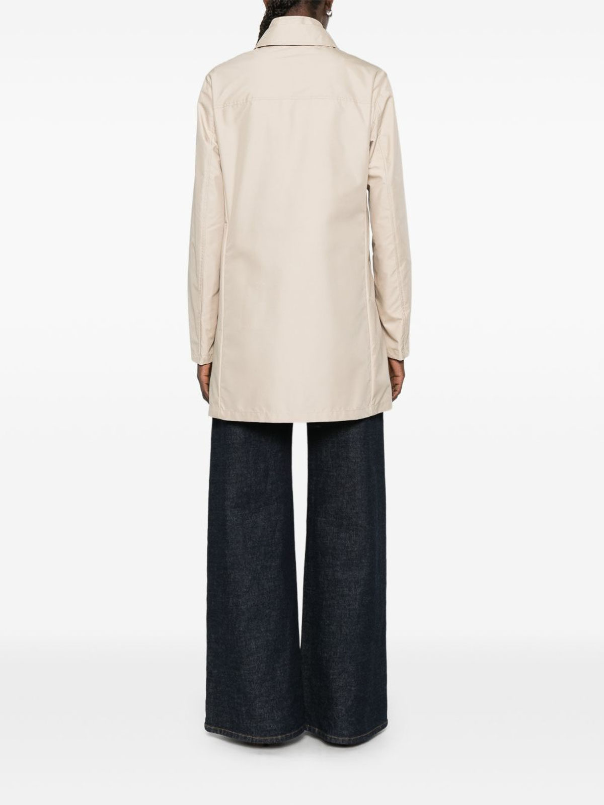 前身頃からの襟と隠し留め具が付いたベージュの防水ジャケット。前面にウェルトポケット、長袖、すっきりとしたシルエットを実現するストレートヘムが特徴です。スタイルを損なうことなく保護力を発揮するようにデザインされており、変わりゆく天候や洗練された日常着に最適です。機能性とモダンなエレガンスを融合させた洗練されたアウターウェアの必需品です