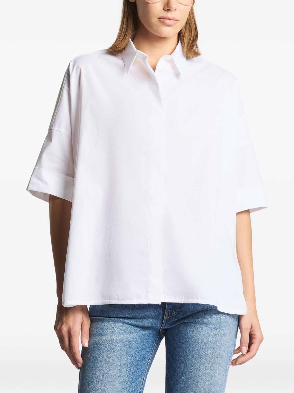Fayの半袖で裾がストレートなホワイトコットンのシャツ。すっきりとしたミニマリストなデザインで、多彩なスタイリングが可能です。カジュアルでシックな服装や洗練された普段着に最適なこのシャツは、着心地と品質、流行に左右されないエレガンスを兼ね備えています。