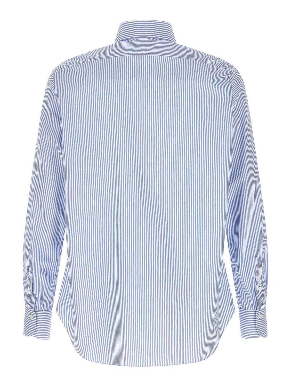 ストライプ柄コットンポプリンのナポリシャツ、フロントボタン留め、袖口付きロングスリーブ、サイドスリットにはコントラストの効いたサテンのロゴディテール。