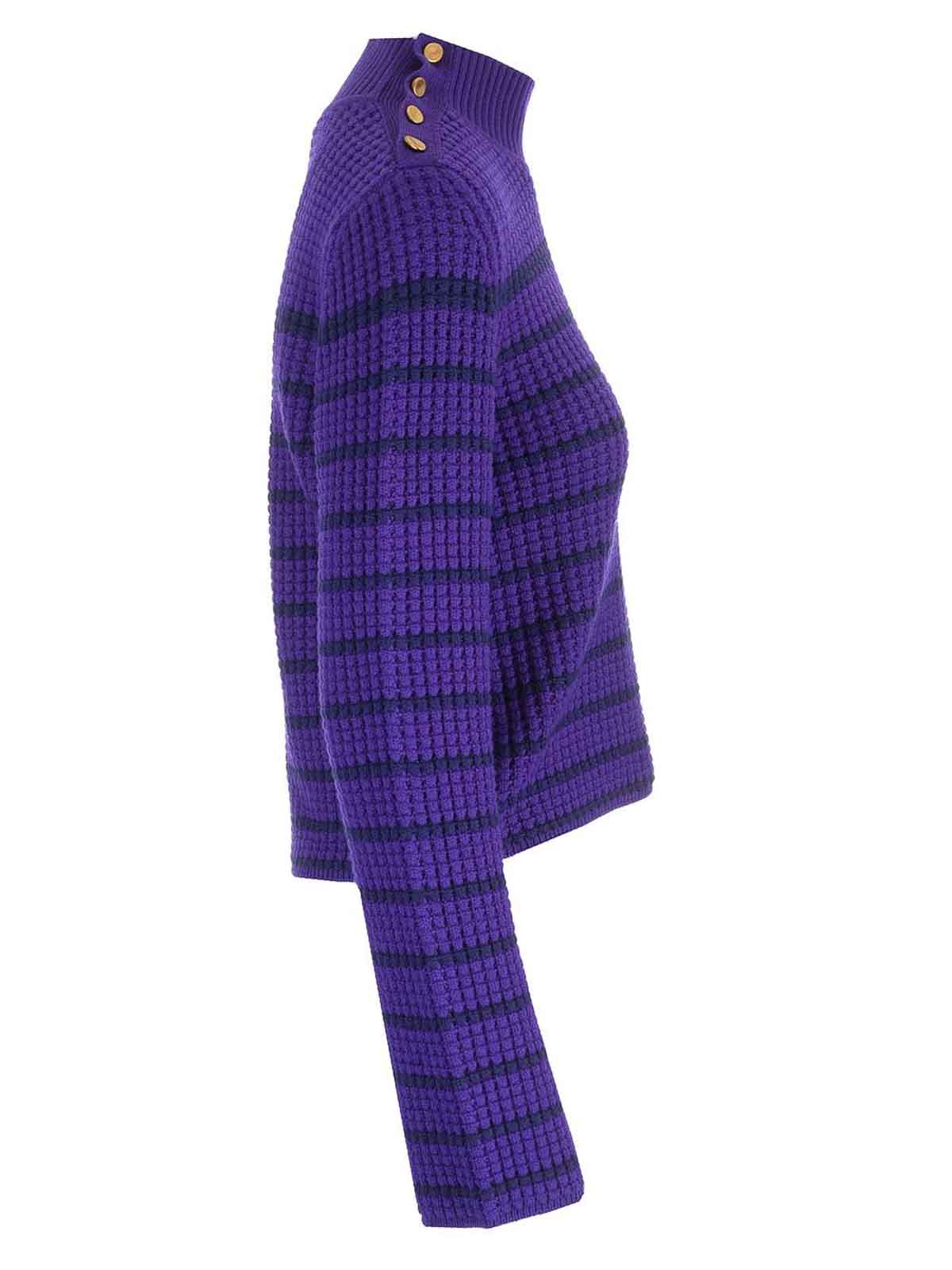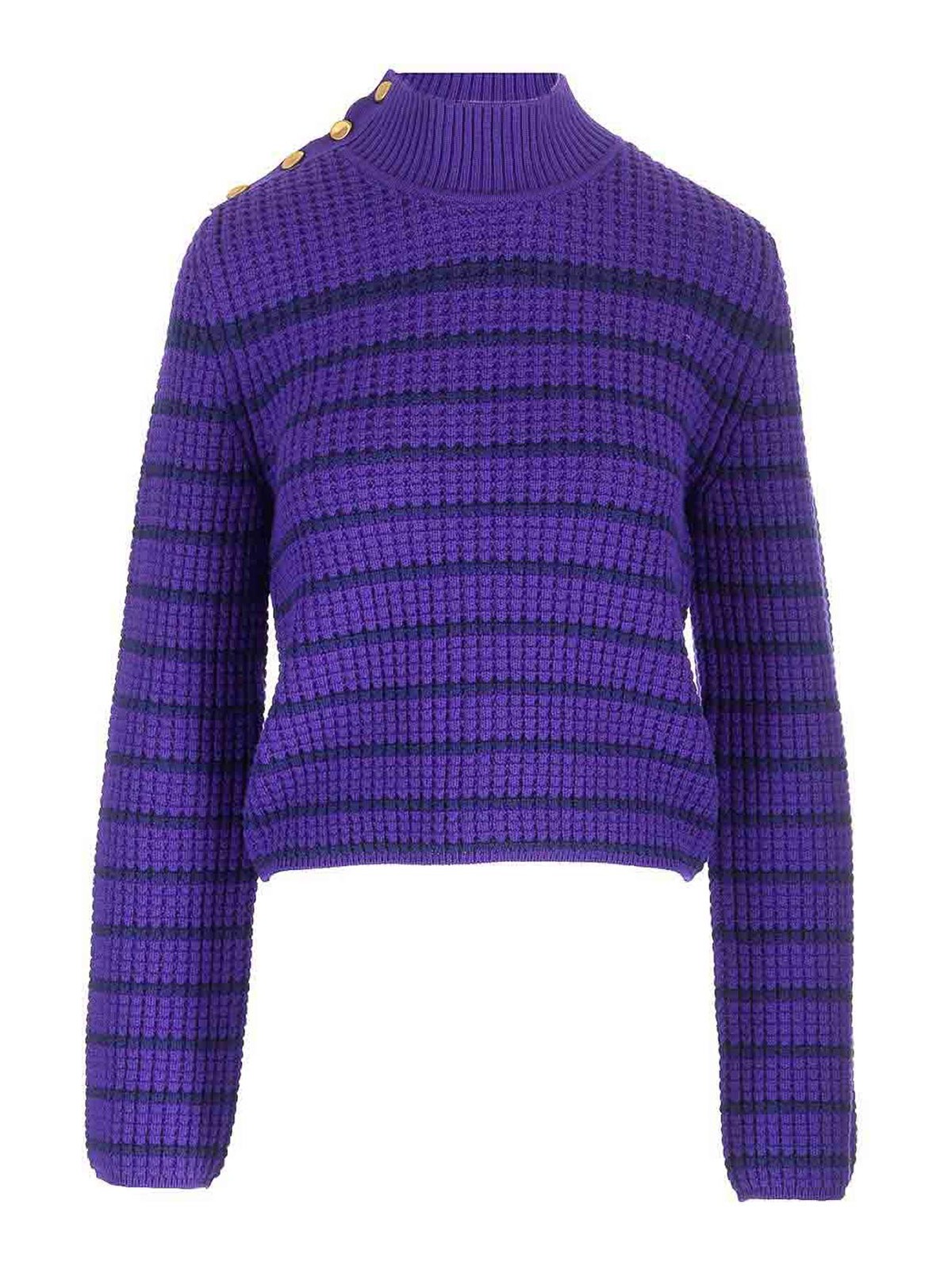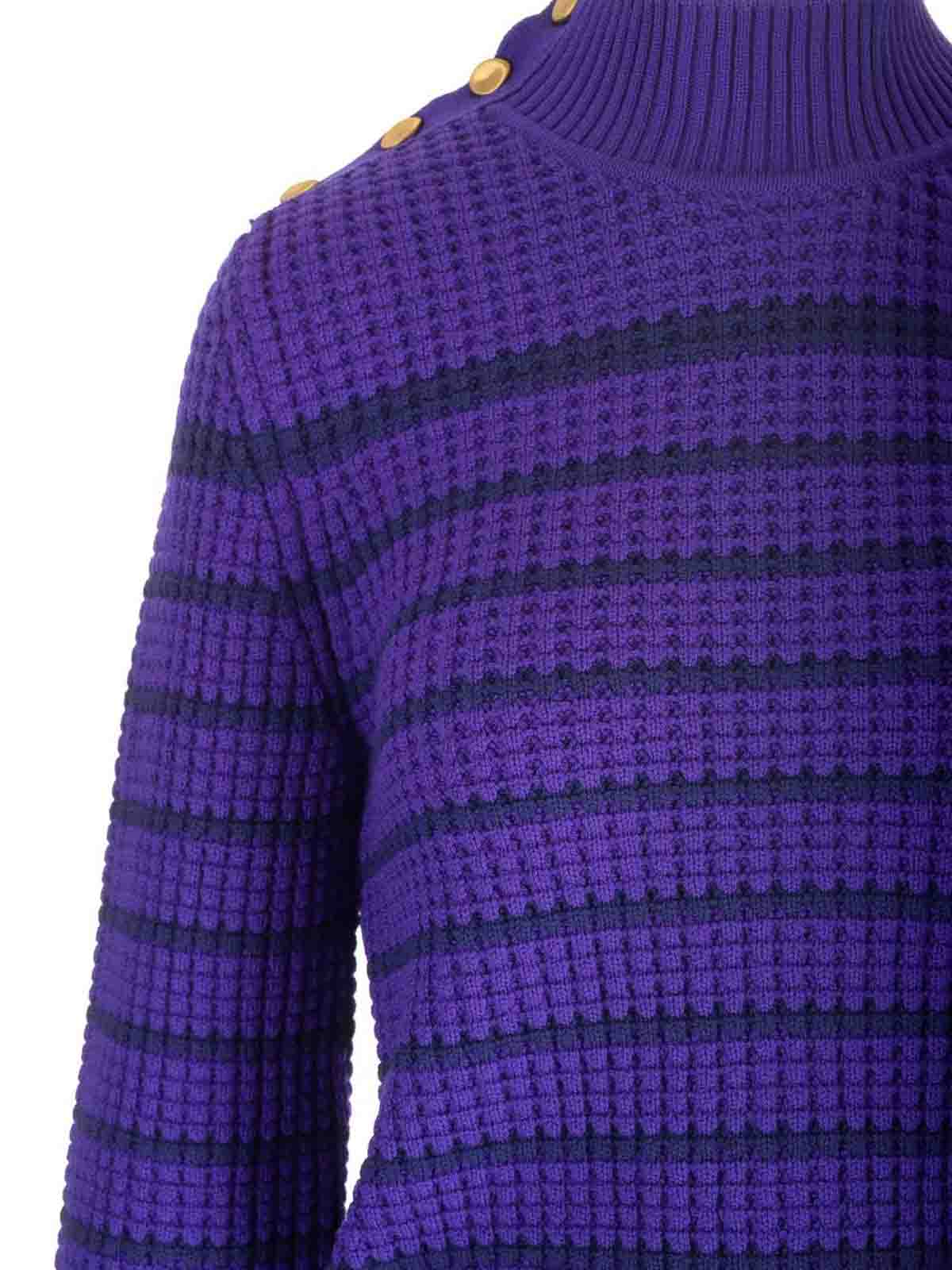 フォルテフォルテのストライプメリノウールニットセーター。肩に装飾ボタン、リブ編みのタートルネック、ロングスリーブが付いています。