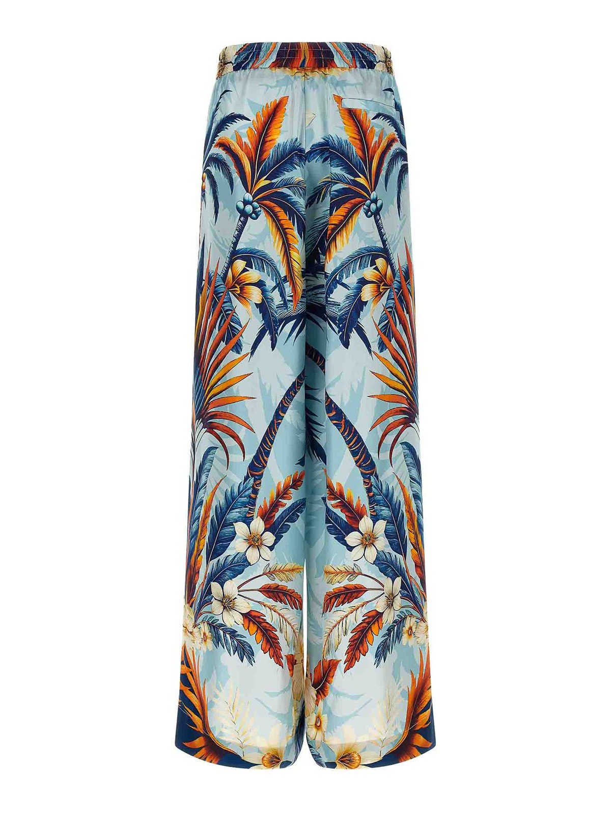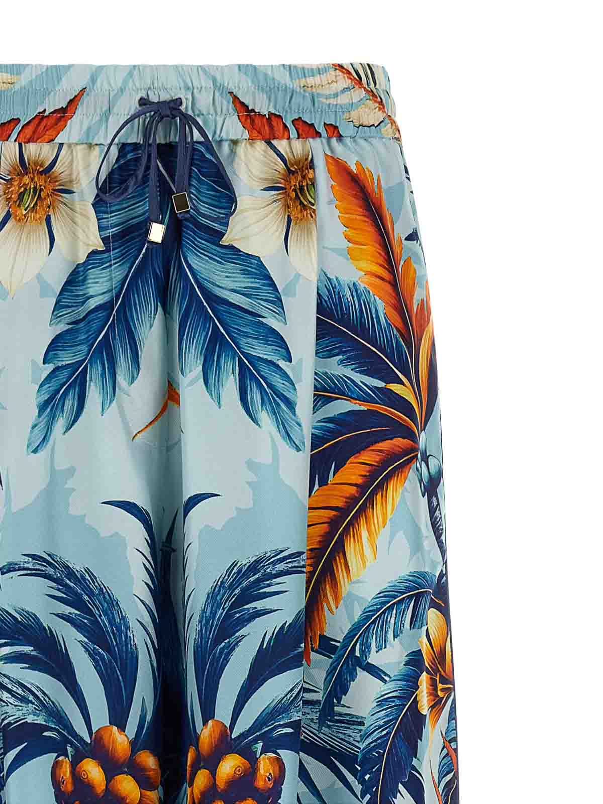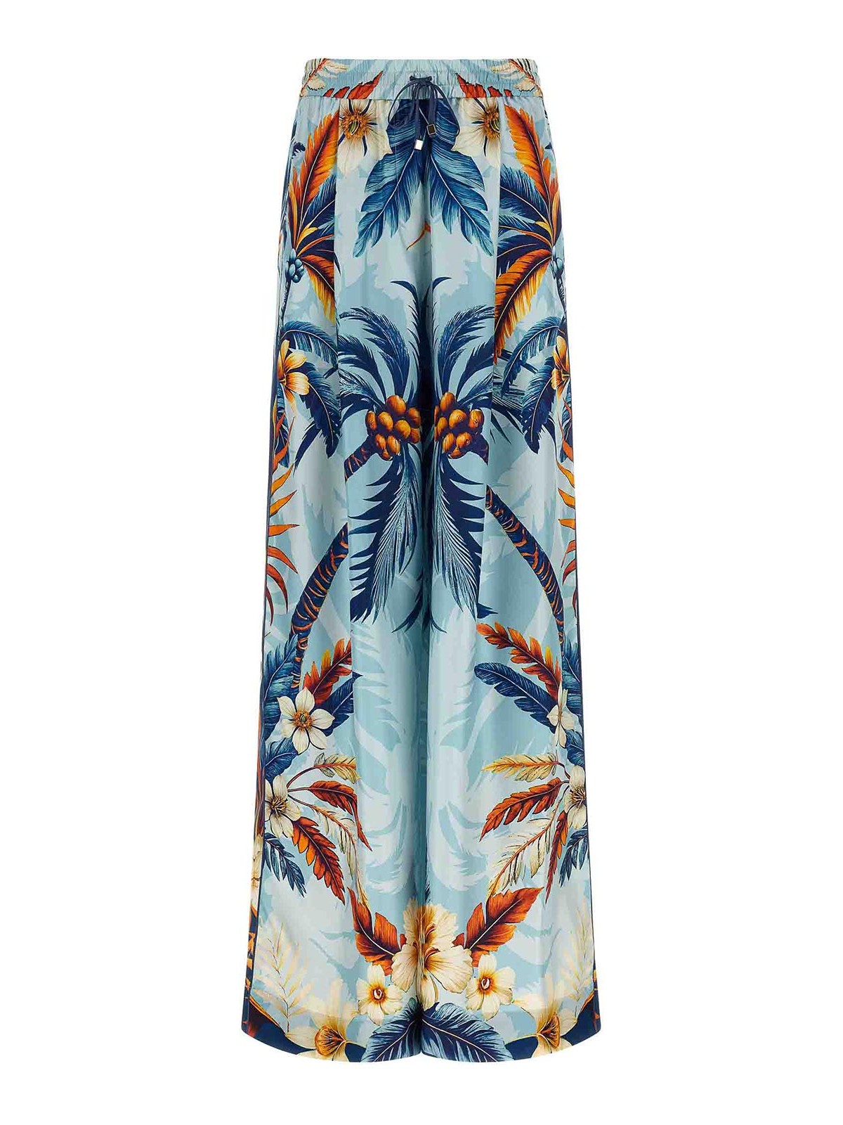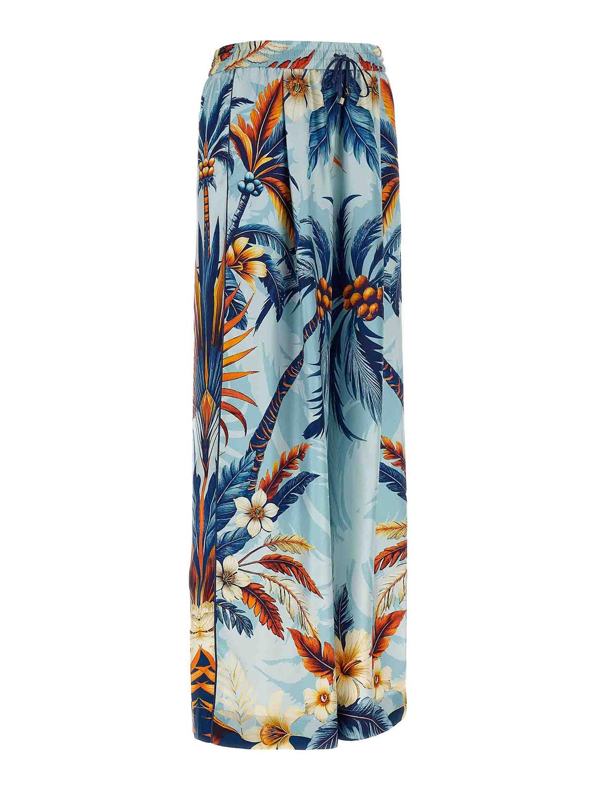 ecubaのオールオーバー「パームブーケ」プリントのシルクツイルパンツ。しっかりとしたサテンのディテール、ドローストリングの伸縮性ウエストバンド、幅広のストレートレッグ、ポケット付き。