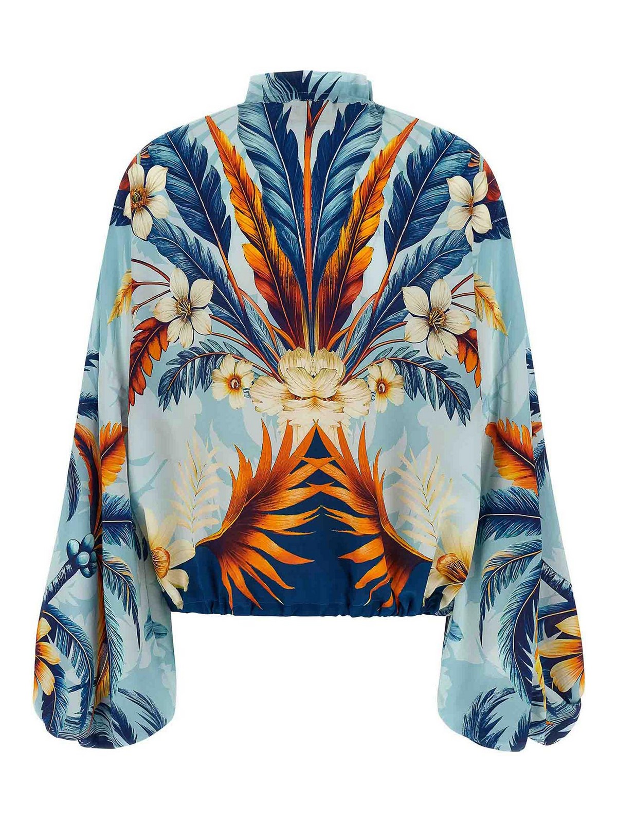 全体にフリル付きの「パームブーケアルチロ」クレープデシンシルクシャツ、ドローストリング付きの調節可能なVネック、フロントボタン留め、伸縮性のある袖口付きのロングバルーンスリーブ、裾にドローストリング付き。