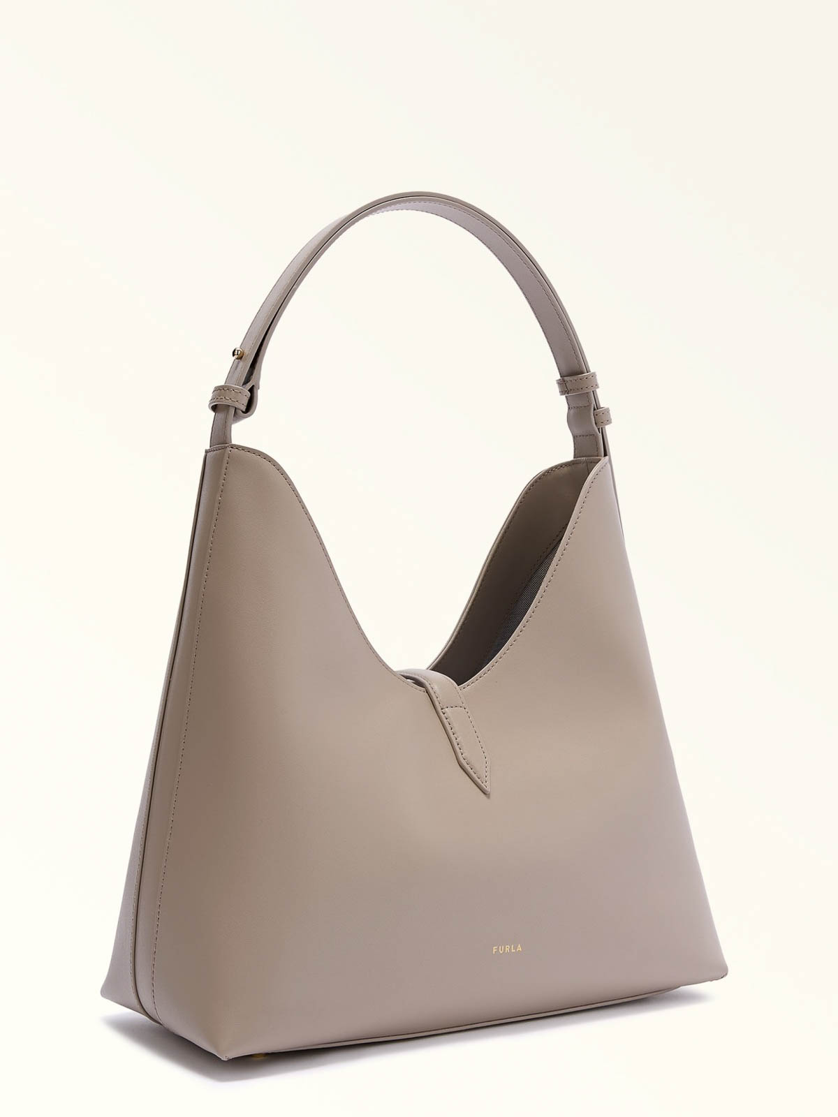 内側は壁に開くレザーホーボーバッグ、調節可能なファスナー付き内ポケット1つ、穴あきフルラロゴ、素材、メタルパーツ、メタルフィート