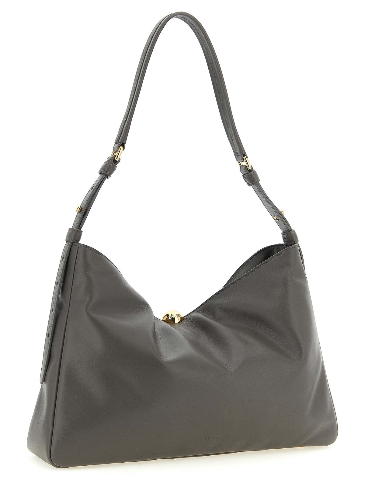 パッド入りの滑らかなナッパレザー製大きな「furla sfera soft」ショルダーバッグ、ボールの金具をあしらったマグネットボタン留め、前面にエンボス加工ロゴ、調節可能なハンドル、金属製の脚が付いた頑丈なベース。