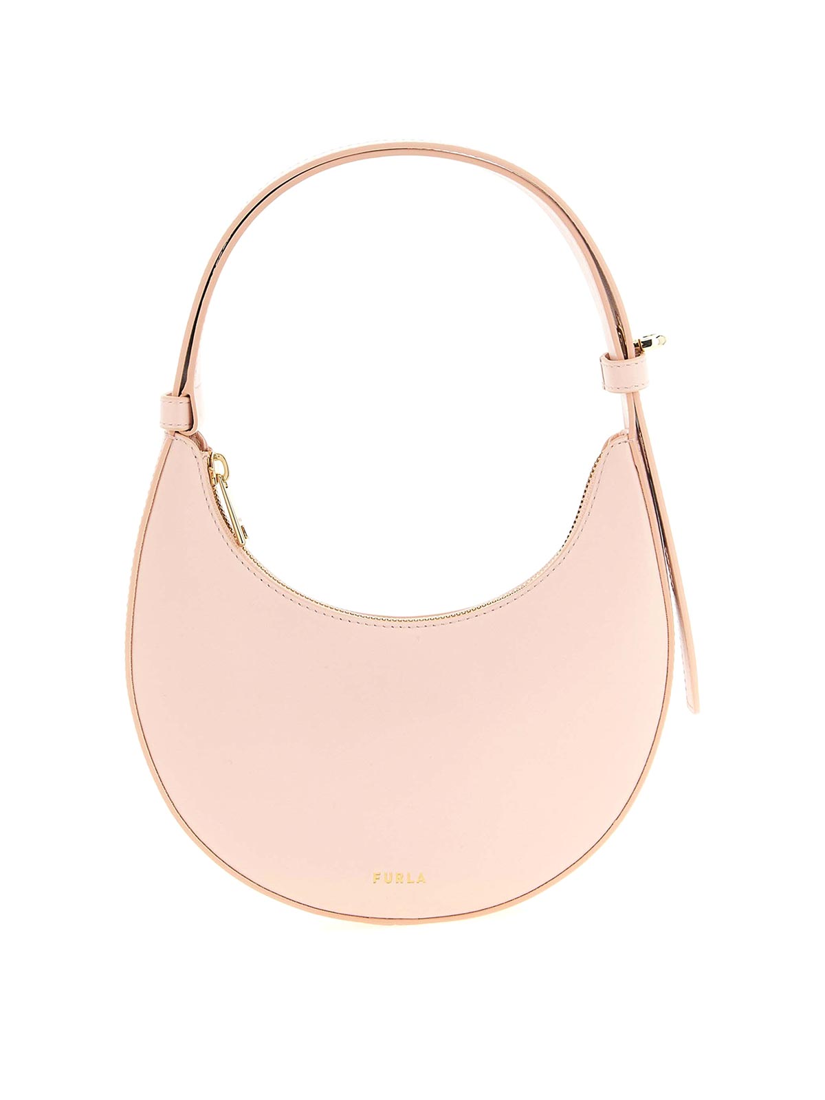furla deliziaのミニレザーショルダーバッグは、シルクのように滑らかな手触り、硬い三日月構造、前面にエンボス加工ロゴ、上部にファスナー開閉、金属製の回転機構付き調節可能なハンドルが特徴です。