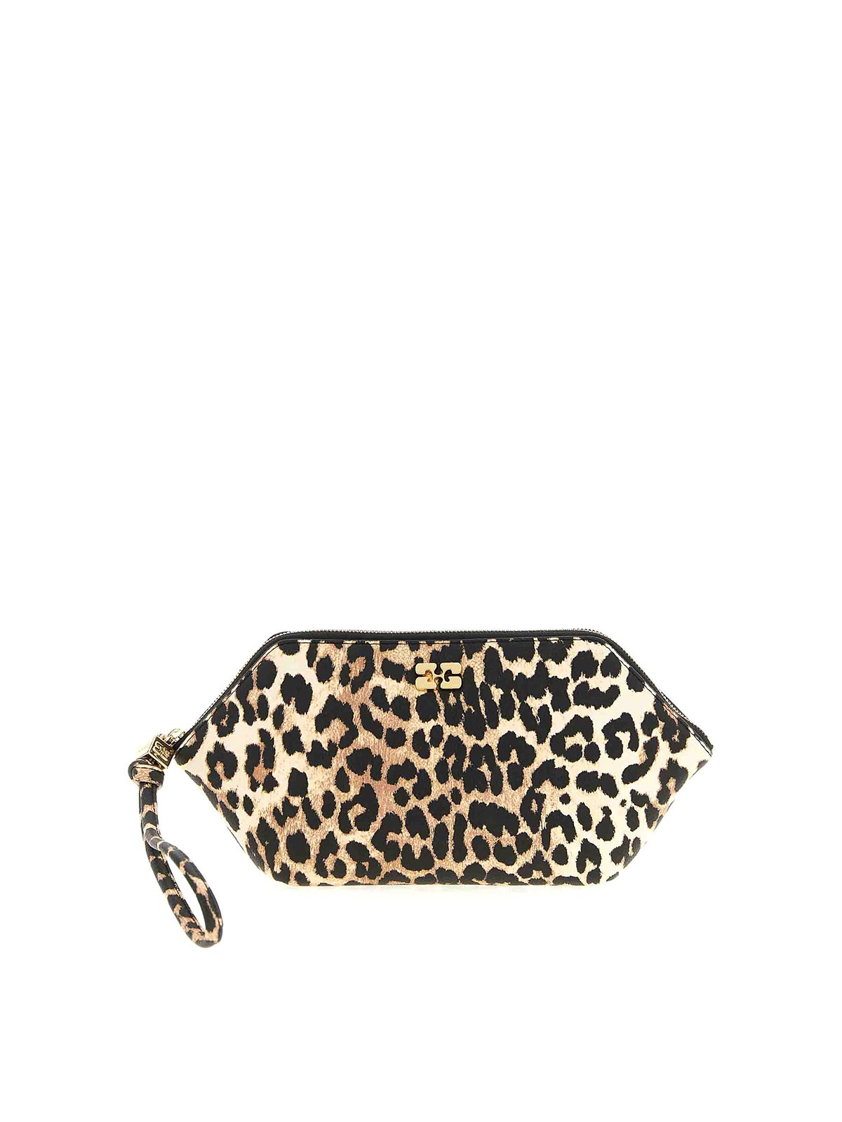 ヒョウ柄の「bou make up」ビューティーケース、前面にメタルロゴ、ジッパー付き。
