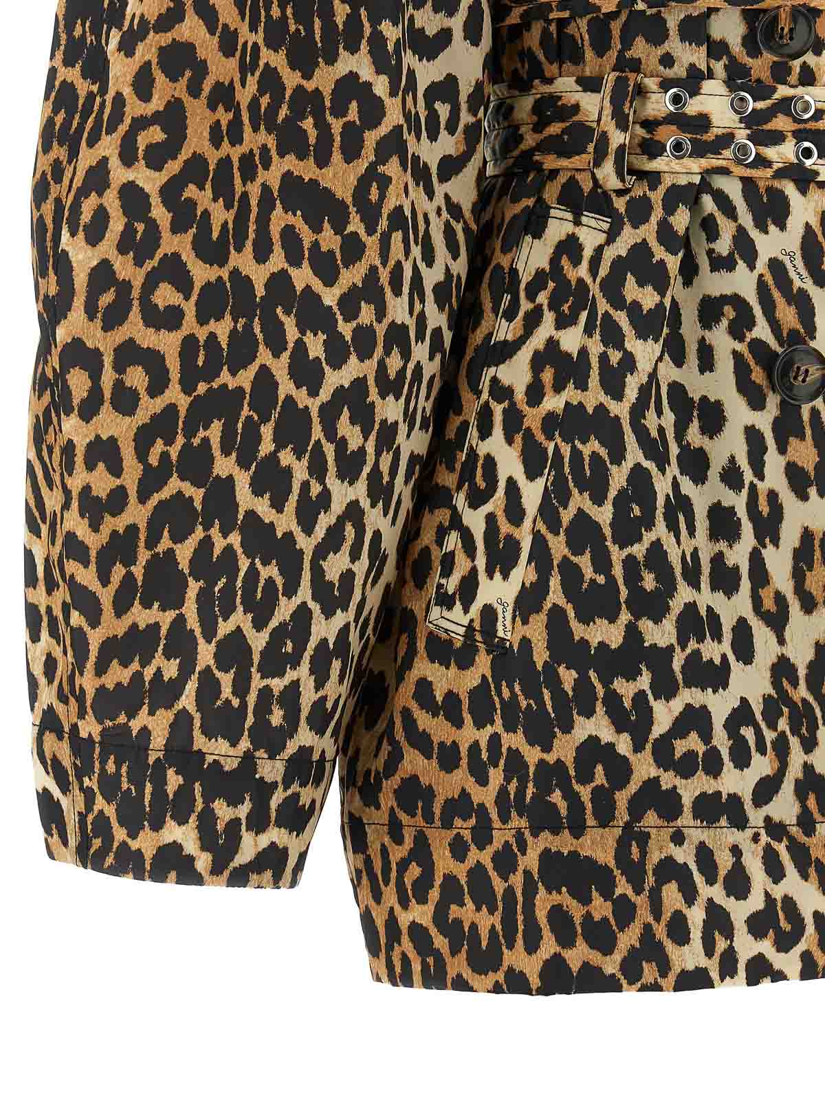 Leopard Duchesse ナイロンショートパンツ撥水加工レオパードダッチェスナイロントレンチコート、フロントボタン留め付きダブルブレストスタイル、取り外し可能なフリルラペル、シャツカラー、ポケット、袖口付きロングワイドスリーブ、ケープ、裏地、取り外し可能なダブルベルト、折りたたみ式。