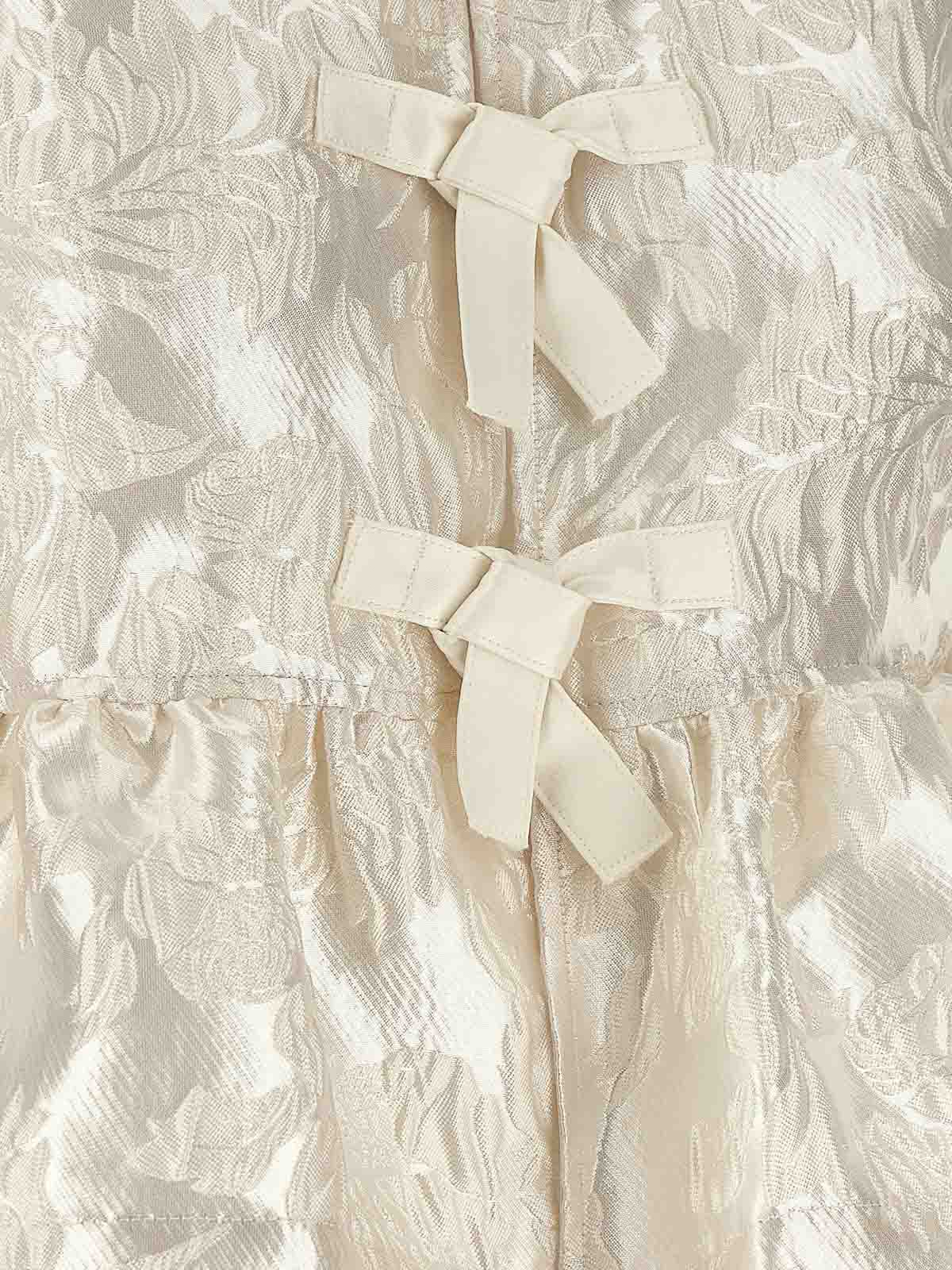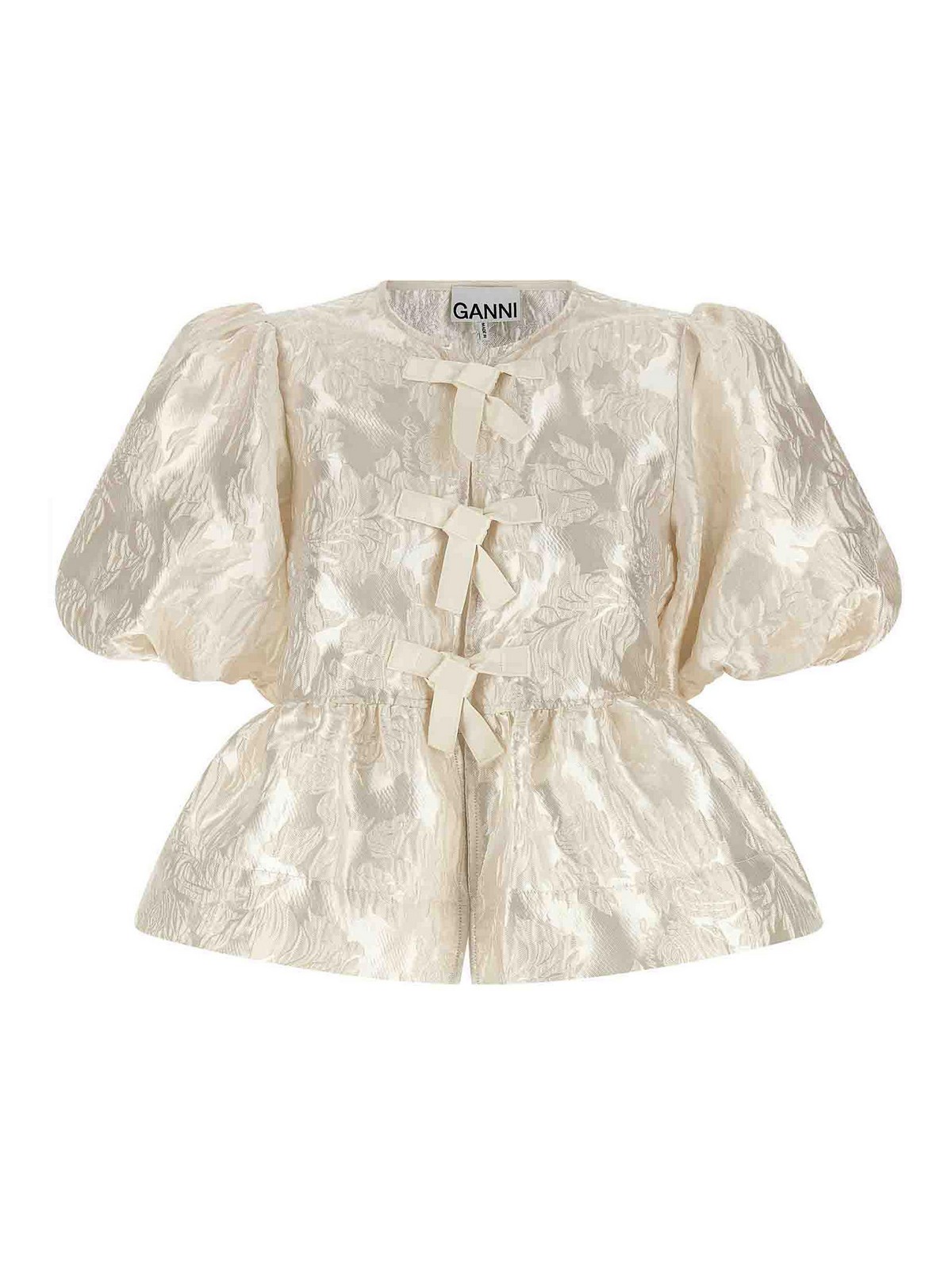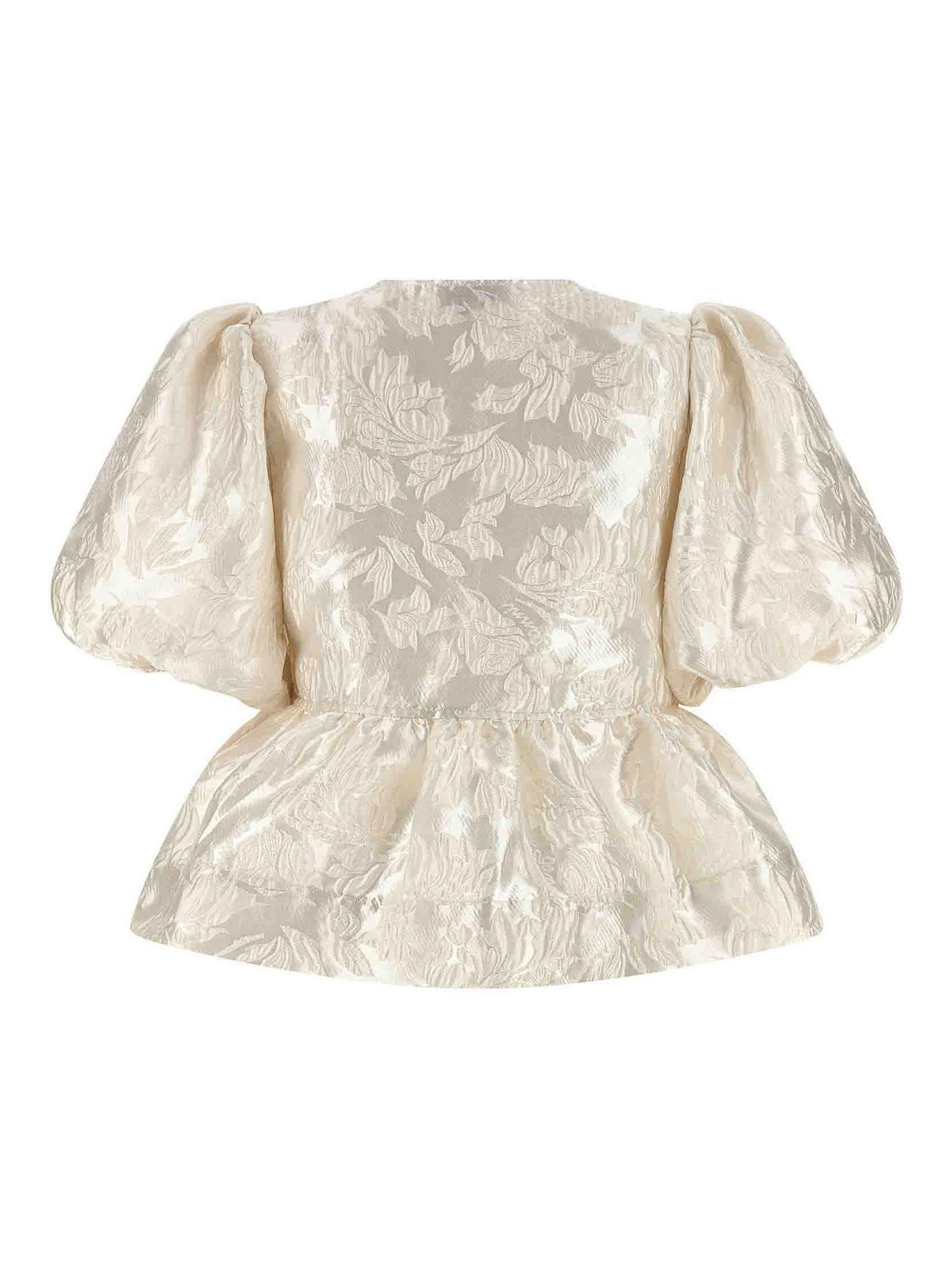 サテンペプラムのジャカードブラウス、フロントレースクロージャー、クルーネック、フリル付きウエストバンド、伸縮性のあるカールしたショートスリーブ。