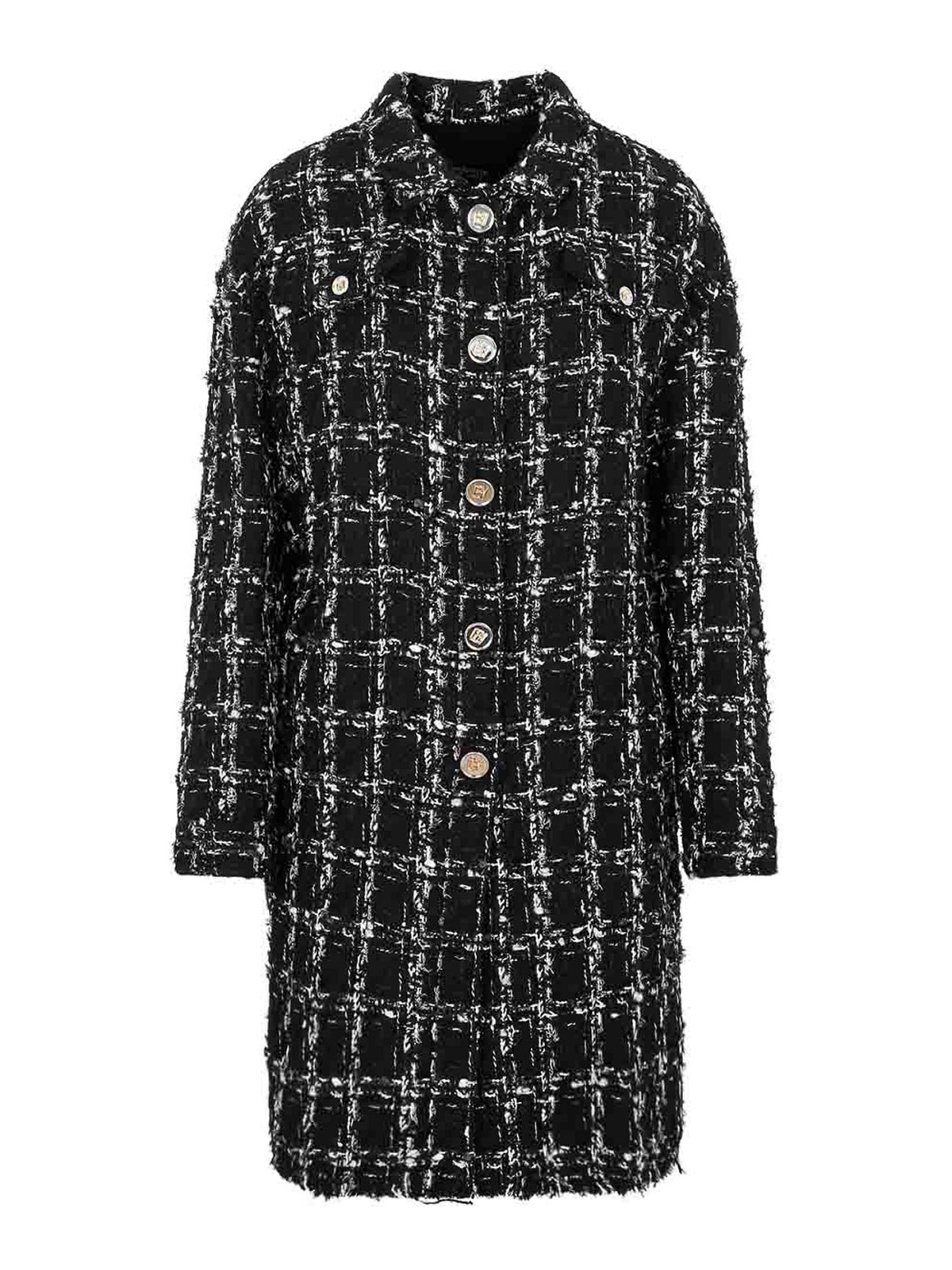 Giambattista valli 黒と白のチェックブークルコート。黒と白のチェックウールブレンド、生地、クラシックカラー、長袖、フロントボタン留め、胸にボタンポケット。総裏地、ドロップショルダー。