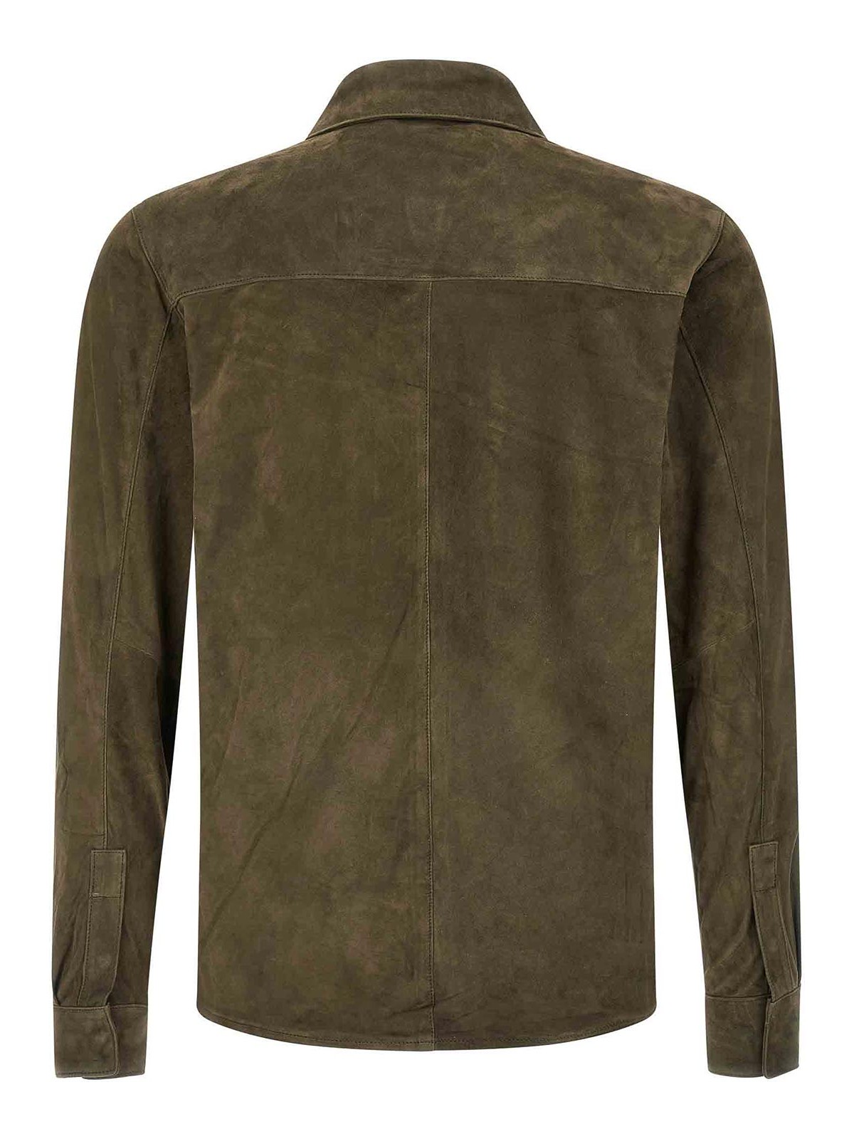 スエードシャツグローブ、ポケット、フロントスナップボタンクロージャー、ロングカフスリーブ。